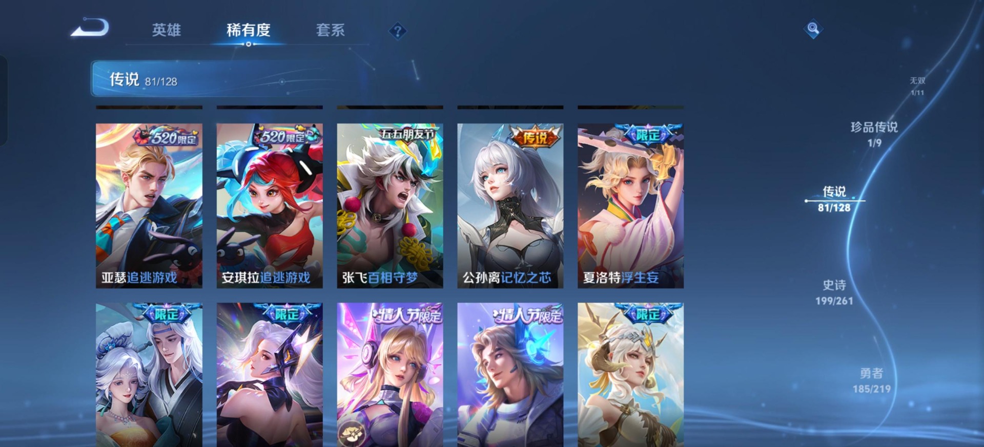 - PX_2085711-??【贵10,千场次李信战士号,金标李信,银标马超铠关羽,全皮露娜,露娜花木兰李白差一个皮肤就全皮,230个戳戳】 3星传说 48按键 15王者印记 满级铭文 CD10719 可二次 安卓Q-V10-487皮肤-2典藏-5无双-1珍品传说-77传说-162史诗【荣耀典藏】:李白鸣剑曳影,花木兰九霄神辉【无双皮肤】:妲己青丘九尾,李白碎月剑心,韩信群星魔术团,不知火舞花合斗,公