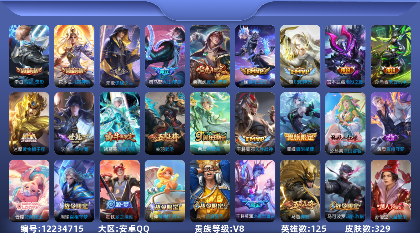 [12234715]V8 2典藏 14传说 125英雄 329皮肤 可修改实名 优质装备:鸣剑·曳影,九霄神辉(木兰典藏),黄金狮子座,久胜战神,炽阳神光,一念神魔,末日机甲-孙尚香(绿蚂蚱),地狱之眼,澜逐花归海,诡秘之主,涂山容容 传说皮:九山相柳 珍宝阁皮:妄想食味,胡桃夹子,女武神 限定皮:鸣野蒿,时雨天司(水龙头),神威(电光马子),高山流水,五谷丰年,武圣,梁祝,李小龙,逐梦之影,一生所爱,大圣娶亲,冰霜恋舞曲,寅虎·赤拳(老虎年限) 史诗皮:赞萌露比,鸭鸭历险记-刘禅,星界战将,龙之律动,百相守梦-周瑜,百相守梦-黄忠,紫霞仙子,白龙吟,特工魅影,千年之狐,永昼,江河有灵,魅语,蒙恬荣光圣徽,无限星赏官,冰冠公主,猫狗日记-孙策,乱世虎臣,节奏热浪,修罗,女仆咖啡,摇滚巨星,水果甜心,绅士熊喵,天才门将,星夜王子,心灵骇客,功夫厨神,德古拉伯爵,暗隐猎兽者,幽灵船长,鬼剑武藏,心灵战警,乐园奇幻夜,舞动绿茵,地狱岩魂,纤云弄巧,繁星吟游(呼啦呼啦),拒霜思,缤纷独角兽,乘风破浪,逐浪之夏,月团寄思,水晶猎龙者,曙光守护者,箭羽风息,金属风暴,原初追逐者,圣诞狂欢,圣诞恋歌,鹰眼统帅,黎明之约,赏金猎手,滕王阁序,无心,未来纪元-赵云