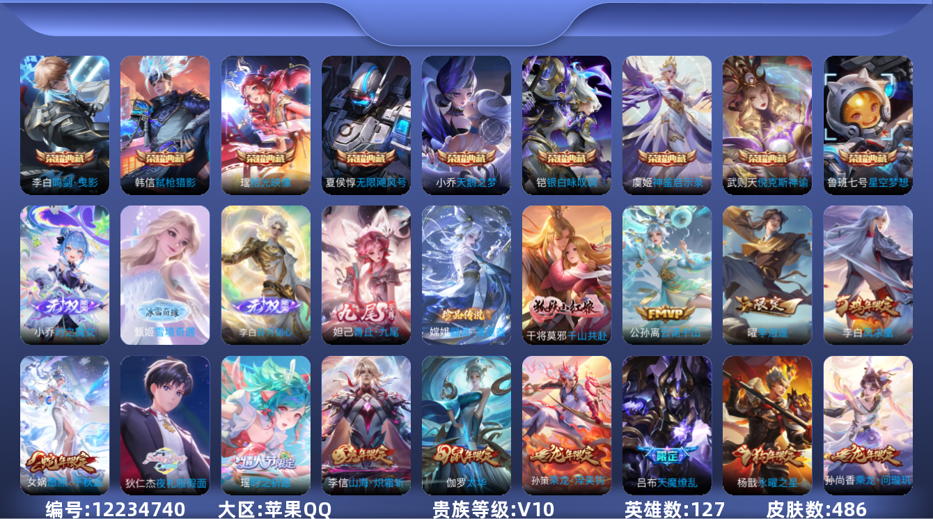 [12234740]V10 9典藏 4无双 1珍品传说 49传说 127英雄 486皮肤 典藏英雄武则天 女号 可修改实名 优质装备:天鹅之梦(小乔典藏),星空梦想(太空人),倪克斯神谕(宇宙婆娘),无限飓风号(高达),鸣剑·曳影,银白咏叹调(倪克斯侍卫),弑枪猎影(韩信典藏),青丘·九尾(妲己无双),碎月剑心(李白无双),神鉴启示录,小乔时之魔女(小乔无双),拾光映像(瑶典藏),雪境奇遇-甄姬,器灵·落星盏,黄金狮子座,黄金射手座,冠军飞将,云鹰飞将(小将军),黄金白羊座,猫影幻舞,一念神魔,云霓雀翎,末日机甲-孙尚香(绿蚂蚱),地狱火,仲夏夜之梦(大飞蛾),音你心动-小乔,海洋之心,地狱之眼,音你心动-周瑜,胖达荣荣,李逍遥,乞巧织情,时之恋人-刘备(电焊工),游龙清影(小青龙),淬星耀世,超时空战士-狄仁杰,花朝如约(花篮子),挚爱之约,山海·炽霜斩(李信年限),浮生妄,青丘·九尾,百相守梦(张飞),追逃游戏(亚瑟),永恒水手月亮,夜礼服假面,艾琳觅芳踪,千山共赴,涂山容容 传说皮:乘龙·问璇玑(孙尚香年限),乘龙·铭钟鼎(赵云年限),乘龙·淬吴钩(孙策年限),吕布曦玄引,云诺千山,幻光神枪 珍宝阁皮:优雅恋人,蔷薇恋人,玩趣恶龙 限定皮:愿照·千秋盛(女娲年限),至尊宝,凤求凰(白切鸡),凤凰于飞,太华(伽罗年限),梅西,武陵仙君(小桃花),异界灵契(白毛香),傲雪梅枪,寅虎·展翼(孙膑年限),白鹤梁神女,白晶晶,山海·碧波行(瑶年限),遇见飞天,高山流水,齐天大圣,五谷丰年,青龙志(铠年限),冰锋战神,游园惊梦,梁祝,岱宗(典韦年限),奔雷神使(牛魔年限),李小龙,永曜之星,辉光之辰,霸王别姬-虞姬,奇迹圣诞,默契交锋-花木兰,真爱至上,纯白花嫁,猪悟能,一生所爱,大圣娶亲,引擎之心,天魔缭乱,青春决赛季,云端筑梦师,热情桑巴,女儿国国王,时之祈愿-云中君,时之祈愿-瑶(瑶传限),枫霜尽,时之奇旅-妲己,山海·玄木吟(马可年限) 史诗皮:化蝶舞,龙之律动,灵蛊蚀心,琥珀纪元伽罗,星界战将,石田雨龙,百相守梦-周瑜,茶境仙,乘龙·忆丹青(大乔年限),百相守梦-黄忠,涂山红红,蒙犽顽岩魄,芈月浮光幕影,乘龙·聚宝船(安琪拉年限),蔬乡物语(鲁班七号),幻珠鲛人,织梦人,紫霞仙子,苍穹之光,电玩小子(小书包),黄金分割率,特工魅影,千年之狐,永昼,冰冠公主,白蛇