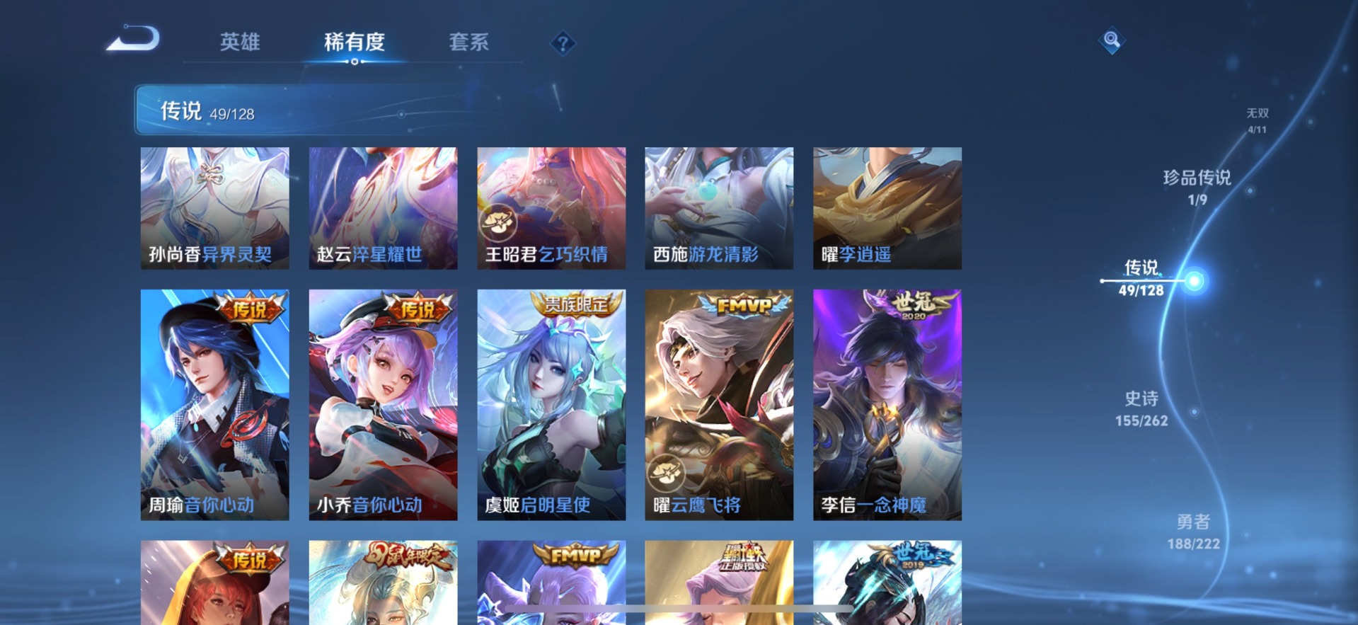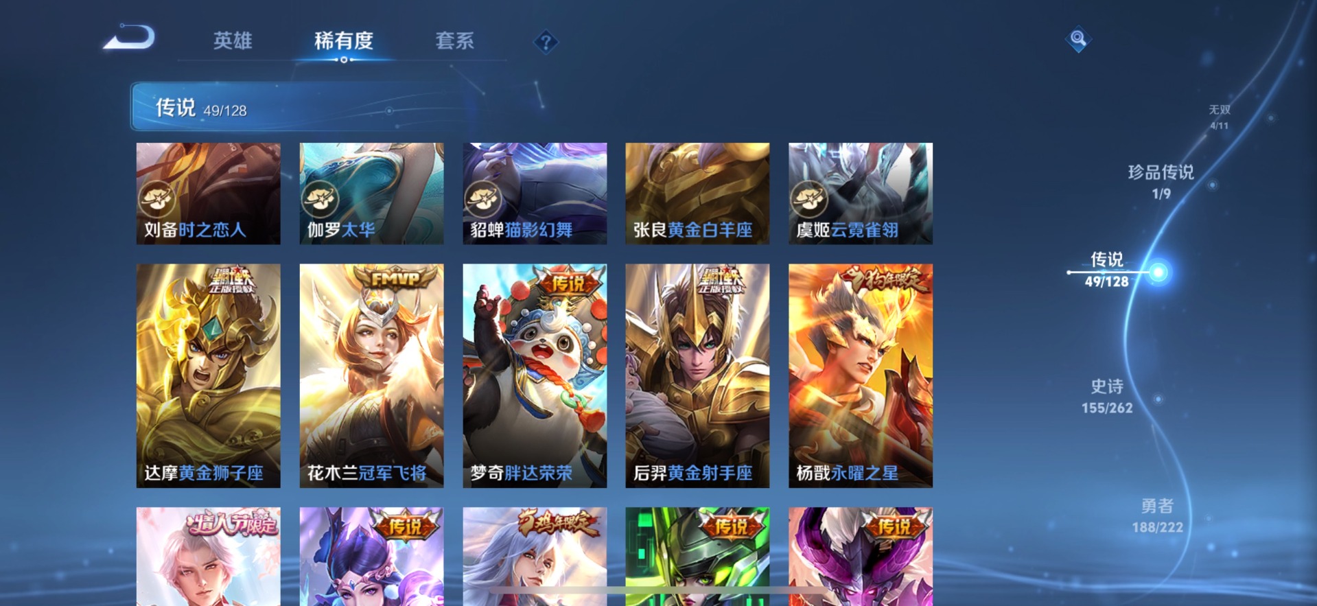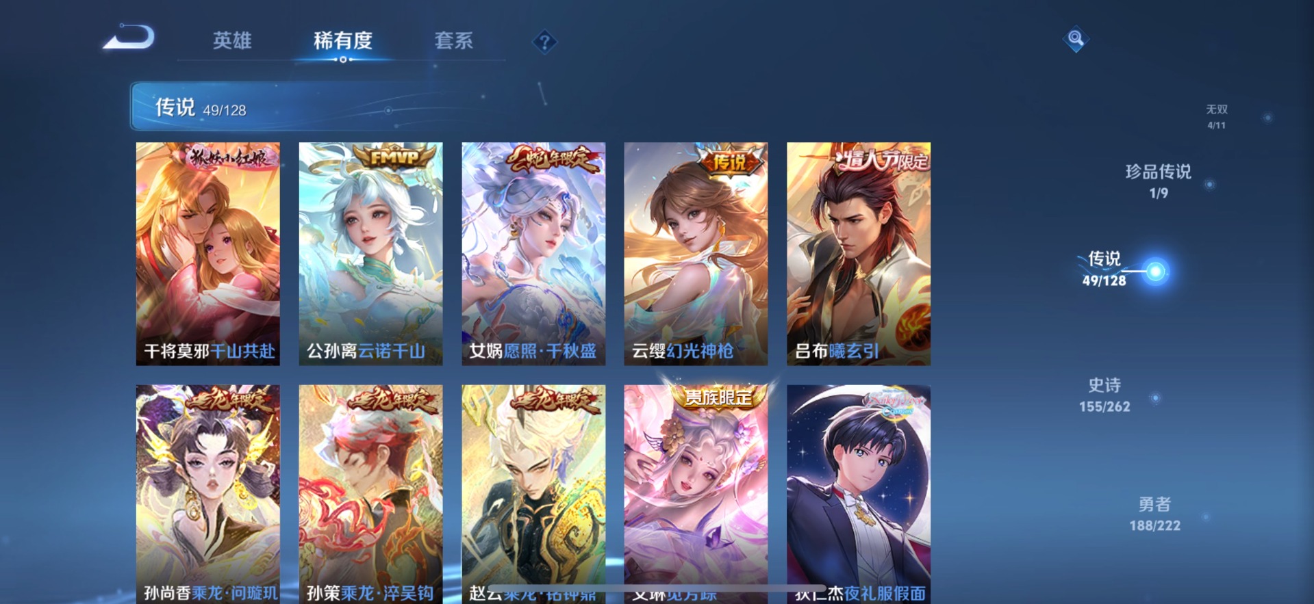 大乔白鹤梁神女,甄姬女儿国国王,铠青龙志,伽罗太华,孙膑寅虎·展翼,小乔纯白花嫁,典韦岱宗,孙尚香异界灵契,牛魔奔雷神使,后羿辉光之辰,露娜一生所爱,庄周云端筑梦师,周瑜真爱至上,裴擒虎梅西,裴擒虎李小龙,上官婉儿梁祝,花木兰默契交锋,花木兰青春决赛季,马可波罗山海·玄木吟,猪八戒猪悟能,女娲愿照·千秋盛,孙悟空大圣娶亲,芈月白晶晶,孙悟空至尊宝,赵云引擎之心,云中君时之祈愿,妲己时之奇旅,韩信傲雪梅枪,蔡文姬奇迹圣诞,瑶时之祈愿,瑶山海·碧波行,虞姬霸王别姬,妲己热情桑巴,王昭君凤凰于飞,关羽冰锋战神,橘右京枫霜尽