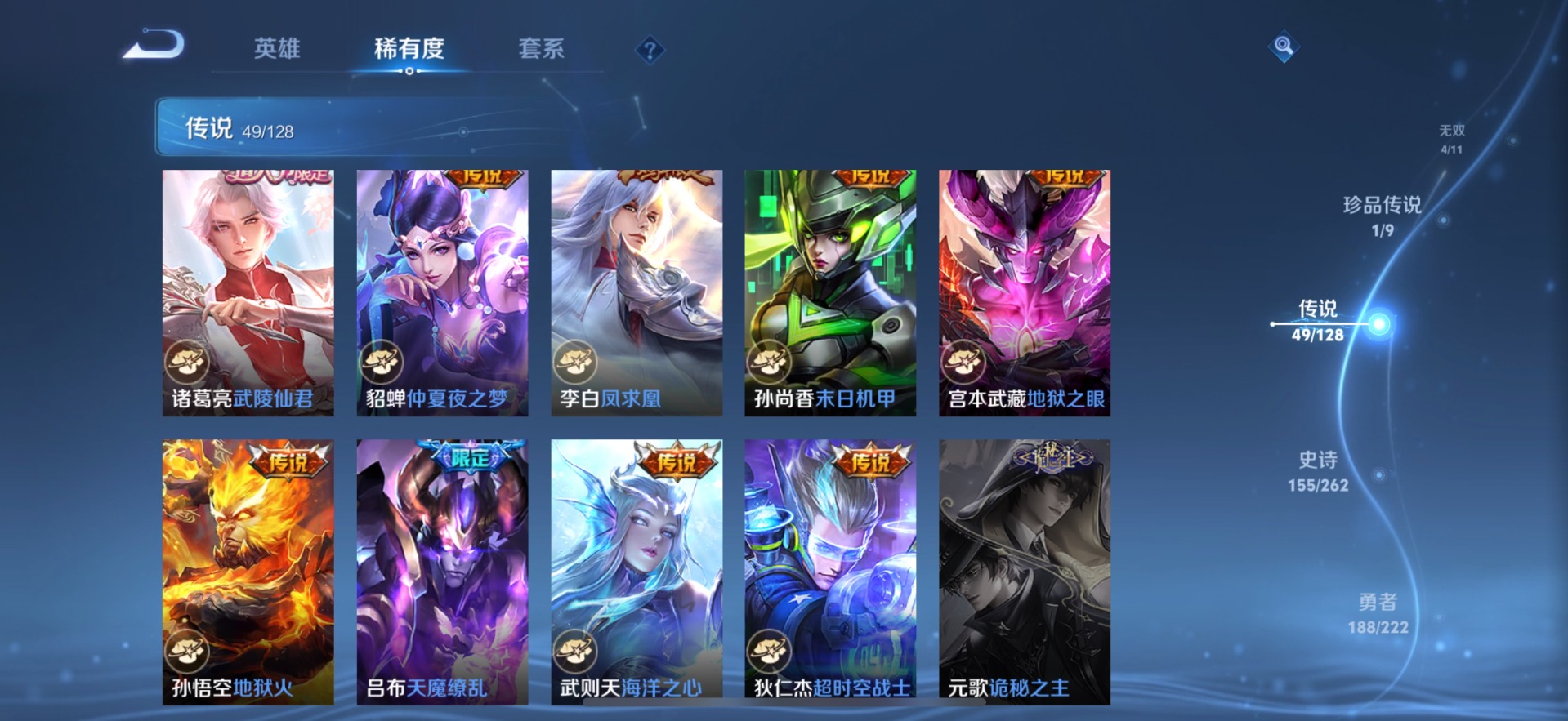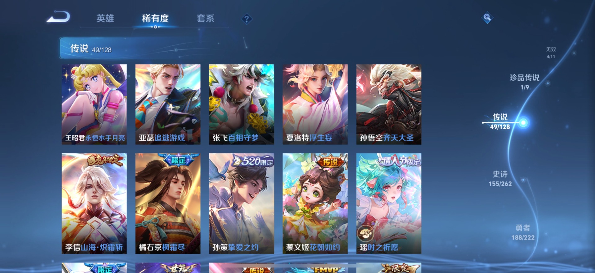 - [11826363]V10 7典藏 45传说 126英雄 488皮肤 典藏英雄武则天 可修改实名 优质装备:倪克斯神谕(宇宙婆娘),鸣剑·曳影,全息碎影(猴子典藏),星域神启(倪克斯贼亮),赤影疾锋,幻阙歌(貂蝉典藏),神鉴启示录,黄金狮子座,黄金射手座,冠军飞将,云鹰飞将(小将军),绛天战甲(鸡嘴战神),黄金白羊座,猫影幻舞,久胜战神,炽阳神光,一念神魔,云霓雀翎,末日机甲-孙尚香(绿蚂蚱),仲夏夜之梦(大飞蛾),音你心动-小乔,地狱之眼,飞鸢探春,音你心动-周瑜,胖达荣荣,乞巧织情,时之恋人-刘备(电焊工),游龙清影(小青龙),超时空战士-狄仁杰,挚爱之约,挚爱花嫁,无双飞将,音你闪耀(rap皮),碎云,天秀幻梦,神器·狴犴令,灼幽烈阳,鹤归松栖(云缨),澜逐花归海,艾琳觅芳踪,涂山容容 传说皮:乘龙·淬吴钩(孙策年限) 珍宝阁皮:妄想食味,优雅恋人,玩趣恶龙 限定皮:鸣野蒿,至尊宝,凤求凰(白切鸡),凤凰于飞,前尘镜,星穹之声,绯月行,至美·乘鲤谣,影龙天霄,遇见飞天,高山流水,匿光决锋者,降魔,五谷丰年,冰锋战神,幽恒(沐浴露),游园惊梦,梁祝,天狼狩猎者,逐梦之星,天狼溯光者,奔雷神使(牛魔年限),李小龙,逐梦之影,逐梦之光,玄武志(苏烈年限),如梦令-后羿,霸王别姬-项羽,霸王别姬-虞姬,默契交锋-兰陵王,真爱至上,纯白花嫁,孙行者,猪悟能,引擎之心,天魔缭乱,热情桑巴,神奇女侠,寅虎·御盾(廉颇年限),启示之音,深海之息(深海大菠萝),唐三藏,枫霜尽,匿光启智者,时之奇旅-妲己,神器·万象笔,天降福星,梦圆繁星,冰霜神祇 史诗皮:鸭鸭历险记-刘禅,灵蛊蚀心,星界战将,龙之律动,石田雨龙,百相守梦-周瑜,蒙犽顽岩魄,琥珀纪元伽罗,超元猎域,乘龙·聚宝船(安琪拉年限),百相守梦-黄忠,紫霞仙子,苍穹之光,电玩小子(小书包),白龙吟,黄金分割率,特工魅影,千年之狐,永昼,江河有灵,匿光侦查者,雪夜绮愿(周瑜),完美假期,魅语,百解令(蒙犽),高渐离燃音魔法,蒙恬荣光圣徽,无限星赏官,冰冠公主,青蛇,偶像歌手,白蛇,晚萤,电玩·爆裂旋风,暗夜猫娘,龙骑士(小龙虾),末日机甲-吕布,猫狗日记-孙策,猫狗日记-大乔,时之恋人-孙尚香,乱世虎臣,节奏热浪,修罗,女仆咖啡,摇滚巨星,水果甜心,绅士熊喵,天才门将,星夜王子,心灵骇客,时之奇旅-安琪拉,功夫厨神,德古拉伯爵,暗隐猎兽者,幽