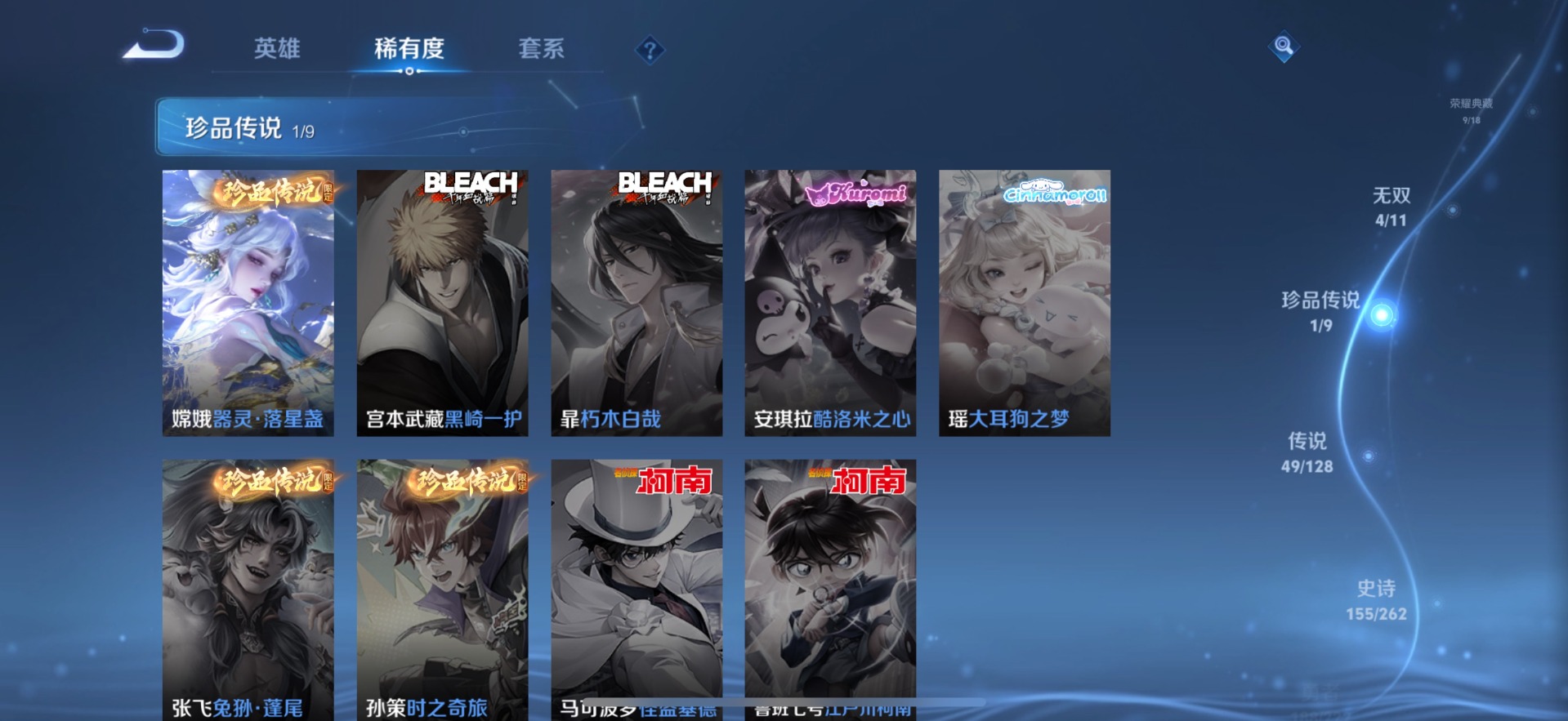 - [11852728]V6 1珍品传说 3传说 123英雄 167皮肤 可修改实名 优质装备:怪盗基德,云鹰飞将(小将军),零号·赤焰,胖达荣荣,涂山容容 珍宝阁皮:蔷薇恋人 限定皮:神威(电光马子),游园惊梦,梁祝,御风骁将(吕布年限),李小龙,逐梦之影,大圣娶亲 史诗皮:百相守梦-百里守约,百相守梦-黄忠,织梦人,白龙吟,千年之狐,暗夜猫娘,龙骑士(小龙虾),猫狗日记-孙策,女仆咖啡,水果甜心,星夜王子,幽灵船长,鬼剑武藏,纤云弄巧,繁星吟游(呼啦呼啦),乘风破浪,逐浪之夏,水晶猎龙者,金属风暴,原初追逐者,圣诞恋歌,鹰眼统帅