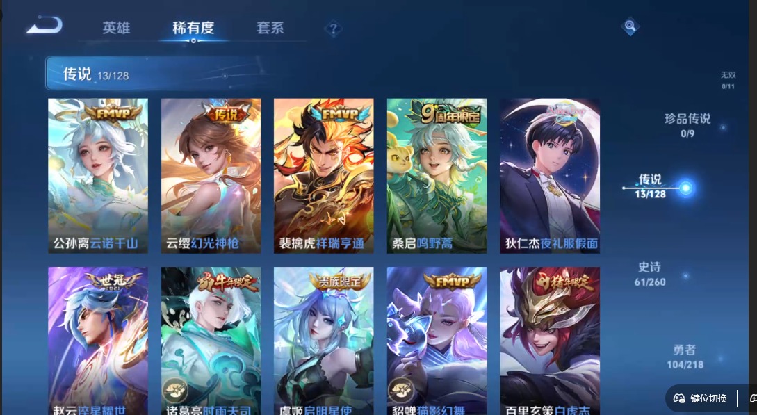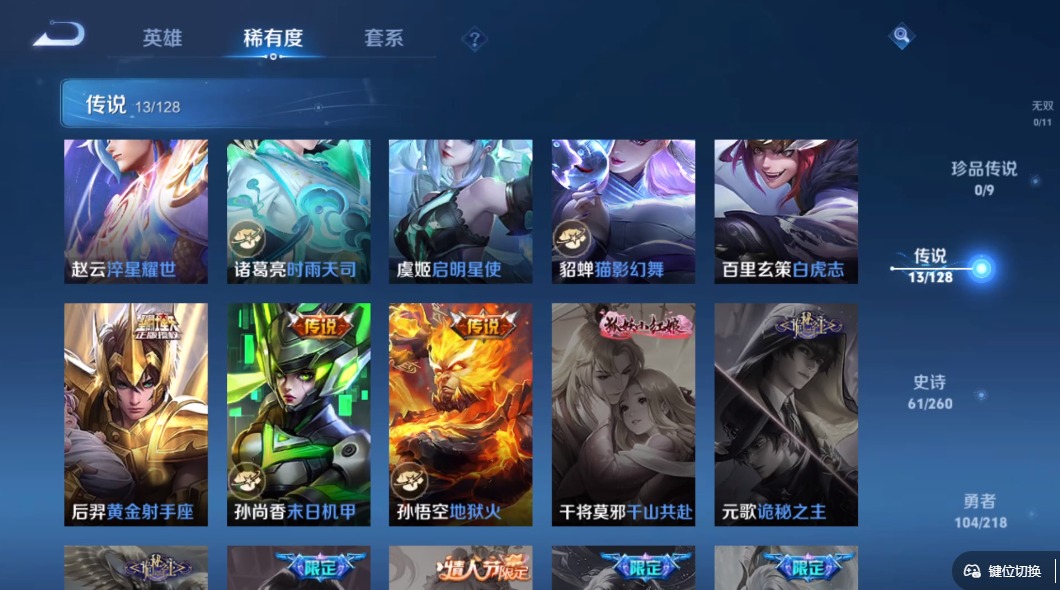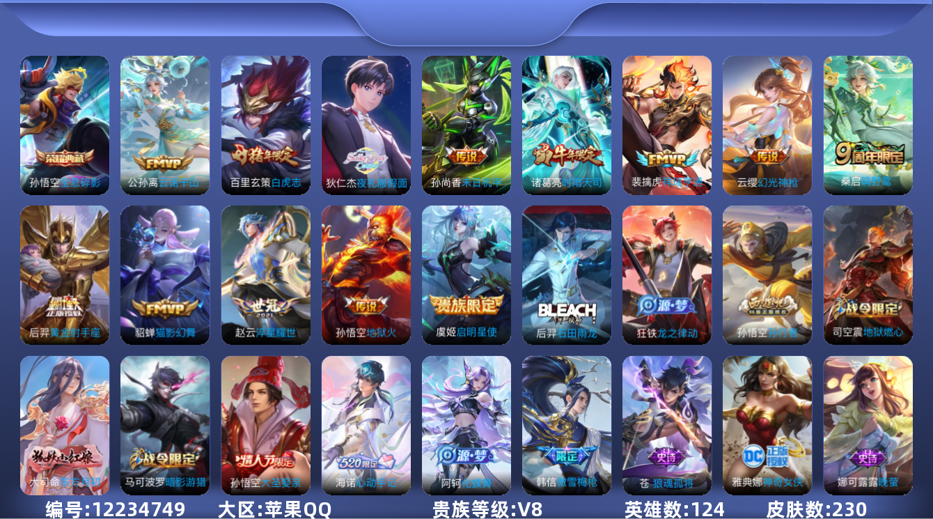 [12234749]V8 1典藏 13传说 124英雄 230皮肤 可修改实名 优质装备:全息碎影(猴子典藏),黄金射手座,猫影幻舞,末日机甲-孙尚香(绿蚂蚱),地狱火,淬星耀世,夜礼服假面 传说皮:云诺千山,祥瑞亨通,幻光神枪 珍宝阁皮:胡桃夹子,优雅恋人 限定皮:鸣野蒿,白虎志(电光耗子),傲雪梅枪,时雨天司(水龙头),五谷丰年,李小龙,孙行者,大圣娶亲,神奇女侠 史诗皮:狼魂孤将,化蝶舞,星界战将,龙之律动,石田雨龙,怒海争锋,东方月初,海诺心动手记,琥珀纪元伽罗,紫霞仙子,特工魅影,千年之狐,江河有灵,百解令(蒙犽),高渐离燃音魔法,冰冠公主,晚萤,猫狗日记-孙策,时之恋人-孙尚香,节奏热浪,修罗,水果甜心,绅士熊喵,星夜王子,心灵骇客,德古拉伯爵,暗隐猎兽者,幽灵船长,鬼剑武藏,暗渊魔法,心灵战警,舞动绿茵,纤云弄巧,拒霜思,乘风破浪,逐浪之夏,水晶猎龙者,曙光守护者,金属风暴,圣诞狂欢,鹰眼统帅,王者之锤,魅力维加斯,黎明之约,无心,未来纪元-赵云