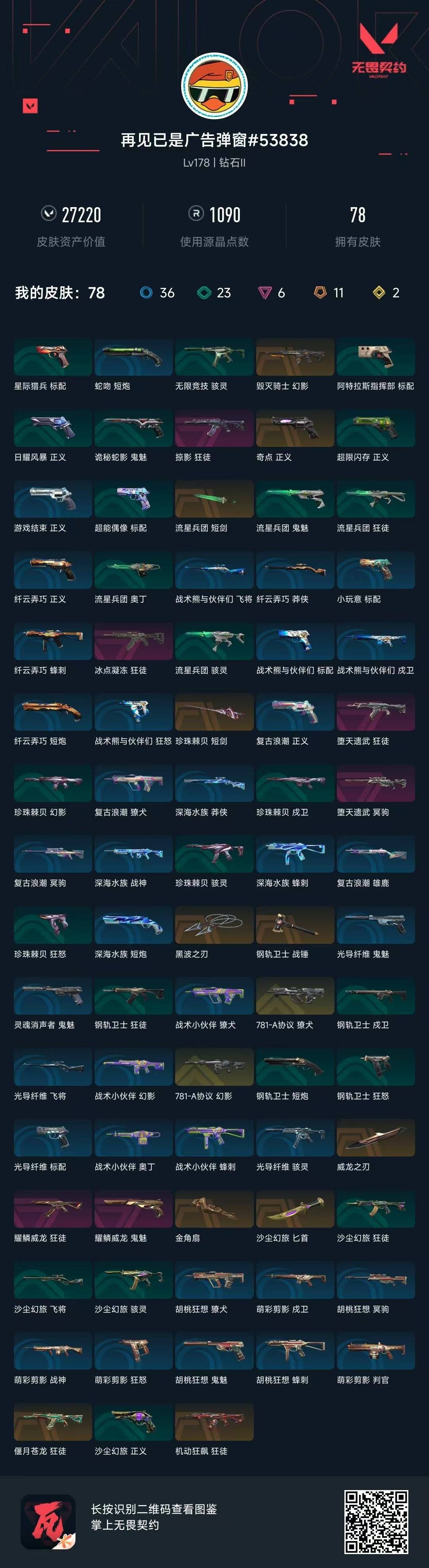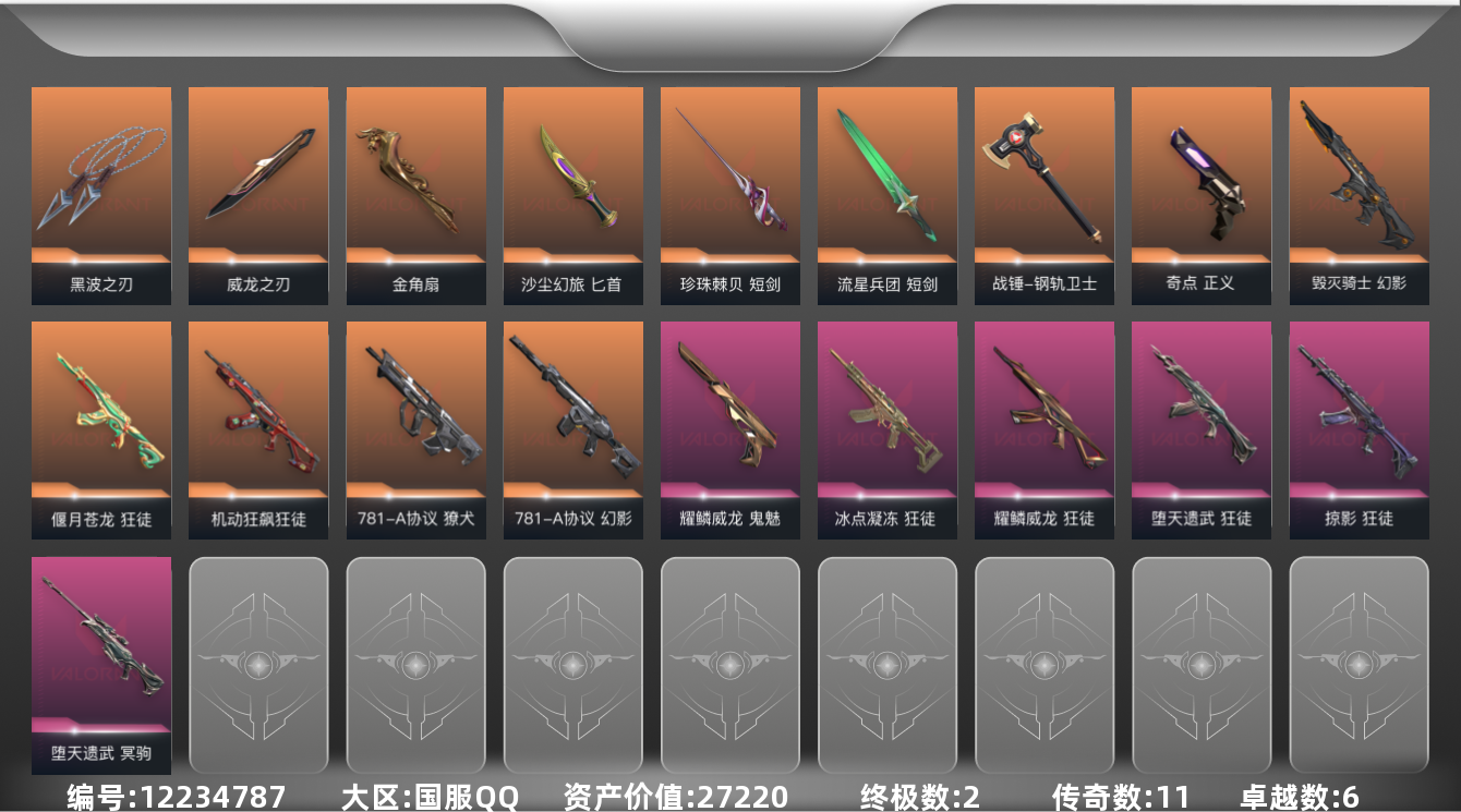 [12234787]11橙皮 2金皮 6紫皮 78皮肤 15英雄 135卡面 1090已用源晶 钻石 优质装备:耀鳞威龙套装,正义-奇点,幻影-781-A协议,狂徒-掠影,狂徒-偃月苍龙,狂徒-机动狂飙,獠犬-781-A协议,冥驹-堕天遗武,幻影-毁灭骑士,狂徒-冰点凝冻,黑波之刃,金角扇,狂徒-耀鳞威龙,威龙之刃,鬼魅-耀鳞威龙 步枪皮肤:狂徒-堕天遗武 近战武器皮肤:战锤-钢轨卫士,短剑-流星兵团,短剑-珍珠棘贝,匕首-沙尘幻旅