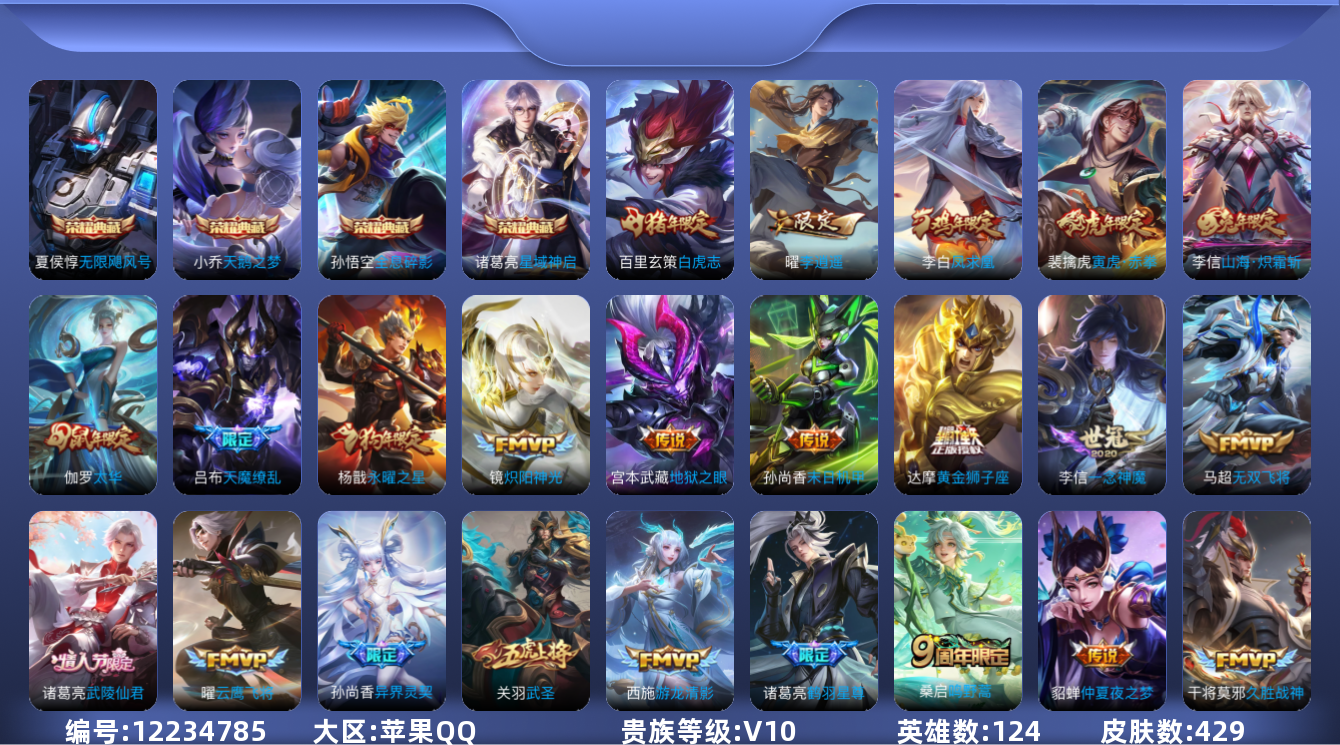 [12234785]V10 4典藏 42传说 124英雄 429皮肤 典藏英雄武则天 可修改实名 优质装备:天鹅之梦(小乔典藏),无限飓风号(高达),全息碎影(猴子典藏),星域神启(倪克斯贼亮),黄金狮子座,冠军飞将,云鹰飞将(小将军),绛天战甲(鸡嘴战神),黄金白羊座,久胜战神,炽阳神光,一念神魔,末日机甲-孙尚香(绿蚂蚱),仲夏夜之梦(大飞蛾),零号·赤焰,海洋之心,地狱之眼,音你心动-周瑜,胖达荣荣,李逍遥,时之恋人-刘备(电焊工),游龙清影(小青龙),淬星耀世,超时空战士-狄仁杰,遇见胡旋,末日机甲-孙策,挚爱之约,无双飞将,山海·炽霜斩(李信年限),鹤羽星尊,艾琳觅芳踪 珍宝阁皮:妄想食味,胡桃夹子,优雅恋人,女武神 限定皮:鸣野蒿,至尊宝,白虎志(电光耗子),凤求凰(白切鸡),凤凰于飞,太华(伽罗年限),梅西,武陵仙君(小桃花),异界灵契(白毛香),傲雪梅枪,寅虎·展翼(孙膑年限),时之彼端,魔法小厨娘,白晶晶,神威(电光马子),飞衡(韩信年限),玄嵩(庄周年限),瑞麟志(木兰年限),遇见飞天,高山流水,诗剑行,五谷丰年,青龙志(铠年限),冰锋战神,幽恒(沐浴露),武圣,天狼运算者,游园惊梦,梁祝,御风骁将(吕布年限),天狼狩猎者,龙胆,逐梦之星,烈魂,岱宗(典韦年限),天狼溯光者,天狼绘梦者,李小龙,逐梦之影,逐梦之光,玄武志(苏烈年限),朱雀志(守约年限),永曜之星,辉光之辰,霸王别姬-项羽,霸王别姬-虞姬,奇迹圣诞,默契交锋-花木兰,孙行者,猪悟能,一生所爱,大圣娶亲,引擎之心,天魔缭乱,青春决赛季,冰霜恋舞曲,乒乒小将,蜜橘之夏,热情桑巴,神奇女侠,匿光追影者,女儿国国王,寅虎·御盾(廉颇年限),寅虎·瑞焰(虎皮蛋子),寅虎·心曲(虎婆),寅虎·赤拳(老虎年限),时之祈愿-云中君,百木心枪,玉兔公主,启示之音,枫霜尽,山海·玄木吟(马可年限) 史诗皮:遇见神鹿,紫霞仙子,苍穹之光,电玩小子(小书包),黄金分割率,特工魅影,千年之狐,永昼,江河有灵,魅语,无限星赏官,匿光破解者,冰冠公主,偶像歌手,晚萤,电玩·爆裂旋风,暗夜猫娘,龙骑士(小龙虾),末日机甲-吕布,猫狗日记-孙策,猫狗日记-大乔,时之恋人-孙尚香,乱世虎臣,节奏热浪,修罗,女仆咖啡,摇滚巨星,水果甜心,绅士熊喵,天才门将,星夜王子,心灵骇客,时之奇旅-安琪拉,功夫厨神,德古拉伯爵,暗隐猎兽者,幽灵船