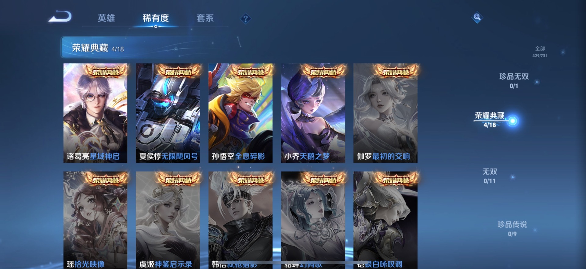 大乔猫狗日记,高渐离天秀·音浪,刘邦德古拉伯爵,夏侯惇乘风破浪,阿轲暗夜猫娘,阿轲节奏热浪,沈梦溪匿光破解者,铠曙光守护者,曹操幽灵船长,廉颇地狱岩魂,伽罗箭羽风息,小乔缤纷独角兽,孙尚香时之恋人,孙策猫狗日记,不知火舞魅语,鲁班七号电玩小子,项羽苍穹之光,吕布圣诞狂欢,吕布末日机甲,露娜紫霞仙子,诸葛亮黄金分割率,刘禅电玩·爆裂旋风,司马懿暗渊魔法,刘禅天才门将,刘禅绅士熊喵,宫本武藏鬼剑武藏,公孙离无限星赏官,兰陵王暗隐猎兽者,貂蝉圣诞恋歌,花木兰水晶猎龙者,夏洛特永昼,李白千年之狐,安琪拉心灵骇客,安琪拉时之奇旅,杨戬天秀·启明,西施诗语江南,白起星夜王子,亚瑟心灵战警,嬴政摇滚巨星,嬴政暗夜贵公子,程咬金功夫厨神,百里玄策原初追逐者,雅典娜冰冠公主,雅典娜黎明之约,李元芳逐浪之夏,百里守约特工魅影,墨子龙骑士,墨子金属风暴,蔡文姬舞动绿茵,瑶遇见神鹿,澜赏金猎手,娜可露露晚萤,王昭君偶像歌手,嫦娥拒霜思,橘右京修罗