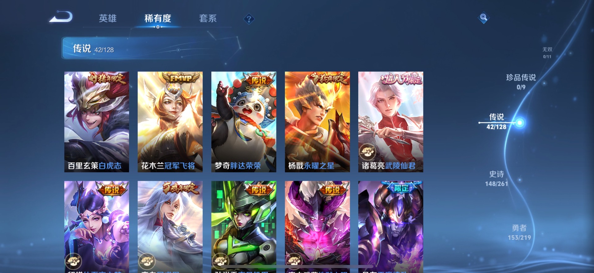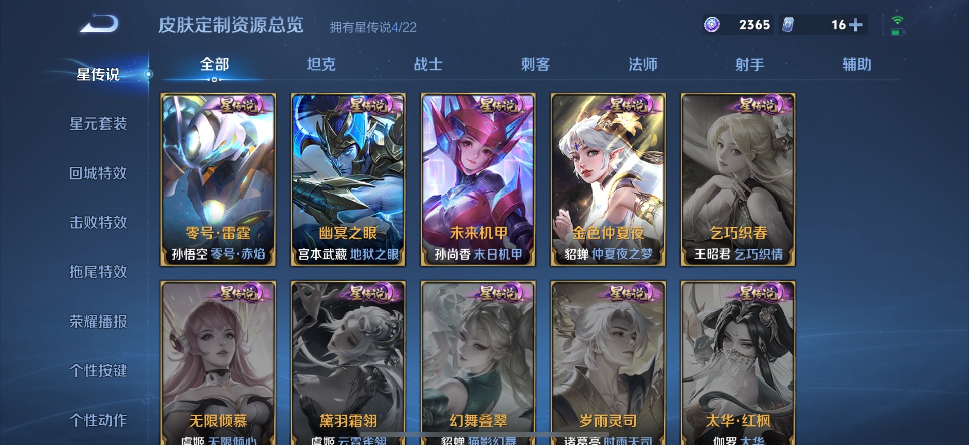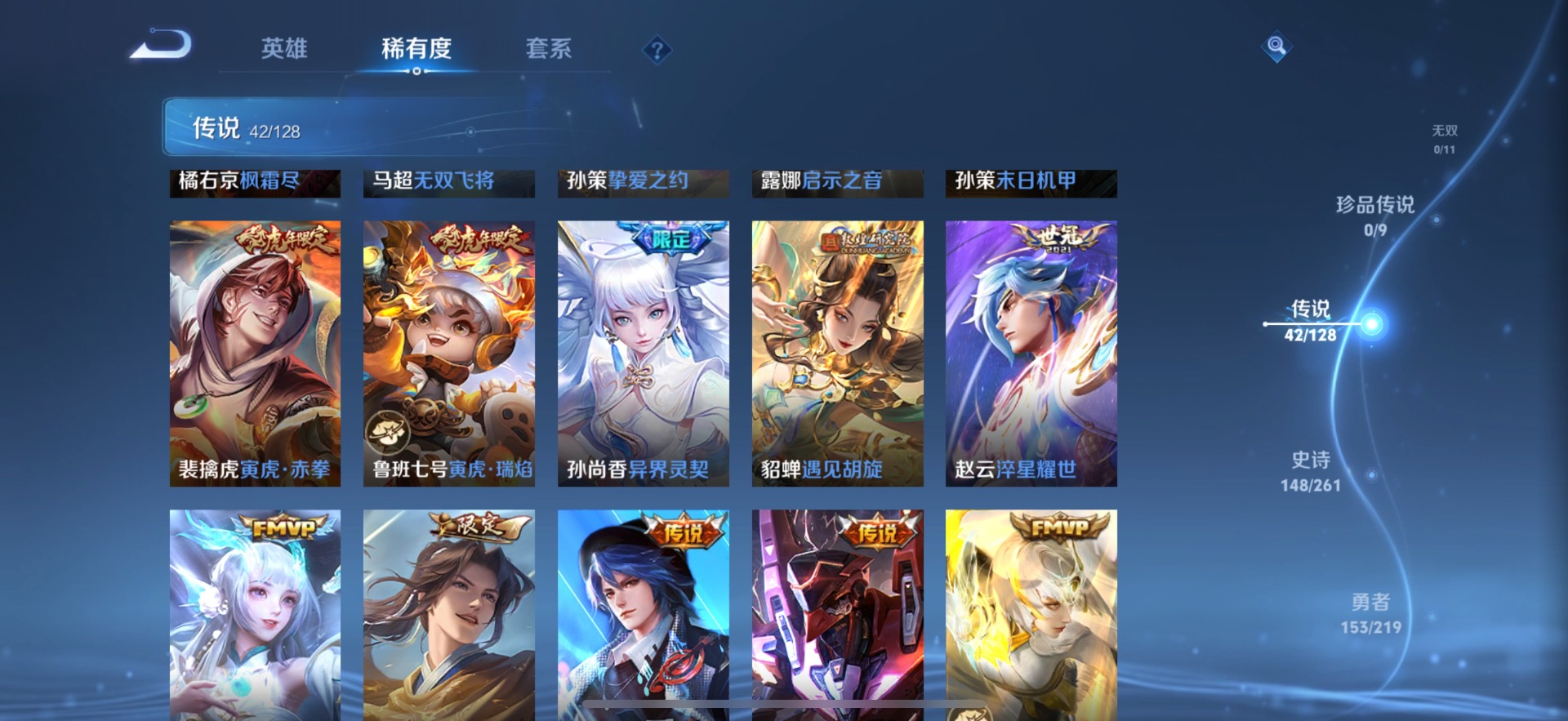 黄忠烈魂,甄姬幽恒,甄姬女儿国国王,铠青龙志,廉颇寅虎·御盾,伽罗天狼溯光者,伽罗太华,苏烈玄武志,赵云百木心枪,赵云龙胆,孙膑天狼运算者,孙膑寅虎·展翼,干将莫邪冰霜恋舞曲,典韦岱宗,孙尚香异界灵契,鲁班七号乒乒小将,项羽霸王别姬,鲁班七号寅虎·瑞焰,吕布御风骁将,露娜启示之音,后羿辉光之辰,露娜一生所爱,庄周玄嵩,镜匿光追影者,杨玉环寅虎·心曲,公孙离玉兔公主,公孙离蜜橘之夏,裴擒虎梅西,裴擒虎李小龙,裴擒虎天狼狩猎者,裴擒虎寅虎·赤拳,东皇太一逐梦之光,上官婉儿梁祝,上官婉儿天狼绘梦者,李白诗剑行,花木兰默契交锋,花木兰瑞麟志,花木兰青春决赛季,安琪拉魔法小厨娘,马可波罗逐梦之星,马可波罗山海·玄木吟,桑启鸣野蒿,猪八戒猪悟能,孙悟空孙行者,孙悟空大圣娶亲,芈月白晶晶,孙悟空至尊宝,百里玄策白虎志,马超神威,雅典娜神奇女侠,赵云引擎之心,云中君时之祈愿,妲己时之彼端,韩信傲雪梅枪,韩信飞衡,韩信逐梦之影,百里守约朱雀志,蔡文姬奇迹圣诞,虞姬霸王别姬,妲己热情桑巴,王昭君凤凰于飞,关羽武圣,关羽冰锋战神,橘右京枫霜尽