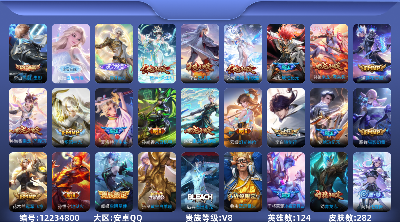 [12234800]V8 1典藏 2无双 19传说 124英雄 282皮肤 可修改实名 女号 优质装备:鸣剑·曳影,碎月剑心(李白无双),雪境奇遇-甄姬,冠军飞将,黄金白羊座,猫影幻舞,炽阳神光,末日机甲-孙尚香(绿蚂蚱),地狱火,浮生妄,澜逐花归海,琥珀纪元铠,琥珀纪元马超 传说皮:乘龙·问璇玑(孙尚香年限),乘龙·铭钟鼎(赵云年限),乘龙·淬吴钩(孙策年限),幻光神枪 珍宝阁皮:妄想食味 限定皮:愿照·众生和(妲己年限),愿照·千秋盛(女娲年限),凤求凰(白切鸡),遇见飞天,诗剑行,青龙志(铠年限),幽恒(沐浴露),游园惊梦,梁祝,天狼征服者,李小龙,逐梦之光,朱雀志(守约年限),辉光之辰,冰霜恋舞曲 史诗皮:器灵·浮梦炉,化蝶舞,琥珀纪元伽罗,星界战将,石田雨龙,乘龙·忆丹青(大乔年限),谪仙醉月,炽弈燎原,撼地雄心,破空之剑,乘龙·聚宝船(安琪拉年限),蔬乡物语(鲁班七号),黄金分割率,特工魅影,千年之狐,冰冠公主,白蛇,青蛇,魅语,无限星赏官,晚萤,偶像歌手,龙骑士(小龙虾),猫狗日记-孙策,乱世虎臣,节奏热浪,女仆咖啡,摇滚巨星,水果甜心,星夜王子,心灵骇客,功夫厨神,德古拉伯爵,暗隐猎兽者,幽灵船长,鬼剑武藏,心灵战警,舞动绿茵,地狱岩魂,纤云弄巧,缤纷独角兽,乘风破浪,逐浪之夏,水晶猎龙者,箭羽风息,原初追逐者,圣诞狂欢,圣诞恋歌,鹰眼统帅,王者之锤,暗夜贵公子,魅力维加斯,黎明之约,无心,未来纪元-赵云