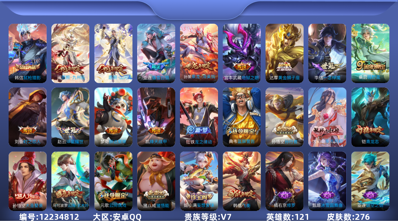 [12234812]V7 1典藏 12传说 121英雄 276皮肤 可修改实名 优质装备:弑枪猎影(韩信典藏),黄金狮子座,绛天战甲(鸡嘴战神),一念神魔,地狱之眼,胖达荣荣,时之恋人-刘备(电焊工),淬星耀世 传说皮:乘龙·淬吴钩(孙策年限),落雪白狼 珍宝阁皮:妄想食味,蔷薇恋人,玩趣恶龙 限定皮:愿照·九州拓(澜年限),愿照·山河定(司空震年限),鸣野蒿,飞衡(韩信年限),高山流水,五谷丰年,青龙志(铠年限),梁祝,李小龙,孙行者,猪悟能,大圣娶亲,山海·玄木吟(马可年限) 史诗皮:星界战将,龙之律动,撼地雄心,破空之剑,东方月初,蒙犽顽岩魄,特工魅影,千年之狐,永昼,百解令(蒙犽),高渐离燃音魔法,蒙恬荣光圣徽,龙骑士(小龙虾),末日机甲-吕布,猫狗日记-孙策,乱世虎臣,节奏热浪,修罗,摇滚巨星,水果甜心,绅士熊喵,天才门将,星夜王子,功夫厨神,暗隐猎兽者,幽灵船长,鬼剑武藏,暗渊魔法,天秀·启明,地狱岩魂,纤云弄巧,繁星吟游(呼啦呼啦),拒霜思,乘风破浪,逐浪之夏,水晶猎龙者,曙光守护者,金属风暴,原初追逐者,圣诞狂欢,鹰眼统帅,魅力维加斯,黎明之约,无心