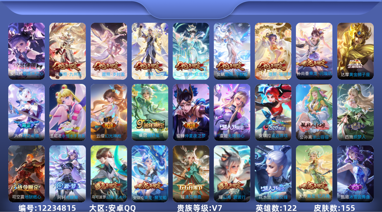[12234815]V7 1珍品传说 15传说 122英雄 155皮肤 可修改实名 女号 优质装备:酷洛米之心,黄金狮子座,仲夏夜之梦(大飞蛾),追逃游戏(安琪拉),大乔-时之奇旅,永恒水手月亮,涂山容容 传说皮:乘龙·问璇玑(孙尚香年限),幻光神枪 珍宝阁皮:蔷薇恋人 限定皮:愿照·九州拓(澜年限),愿照·福禄聚(蔡文姬年限),愿照·岁时盈(虞姬年限),愿照·山河定(司空震年限),愿照·众生和(妲己年限),愿照·千秋盛(女娲年限),逐霄战戟,陌上桑,鸣野蒿,魔法小厨娘,山海·碧波行(瑶年限),无限倾心-虞姬,五谷丰年,默契交锋-花木兰,山海·玄木吟(马可年限) 史诗皮:化蝶舞,乘龙·聚宝船(安琪拉年限),乘龙·忆丹青(大乔年限),织梦人,遇见神鹿,电玩小子(小书包),黄金分割率,特工魅影,江河有灵,百解令(蒙犽),高渐离燃音魔法,青蛇,偶像歌手,暗夜猫娘,银翎春语,猫狗日记-孙策,节奏热浪,女仆咖啡,水果甜心,星夜王子,心灵骇客,时之奇旅-安琪拉,暗隐猎兽者,舞动绿茵,地狱岩魂,纤云弄巧,拒霜思,缤纷独角兽,金属风暴,鹰眼统帅,无心