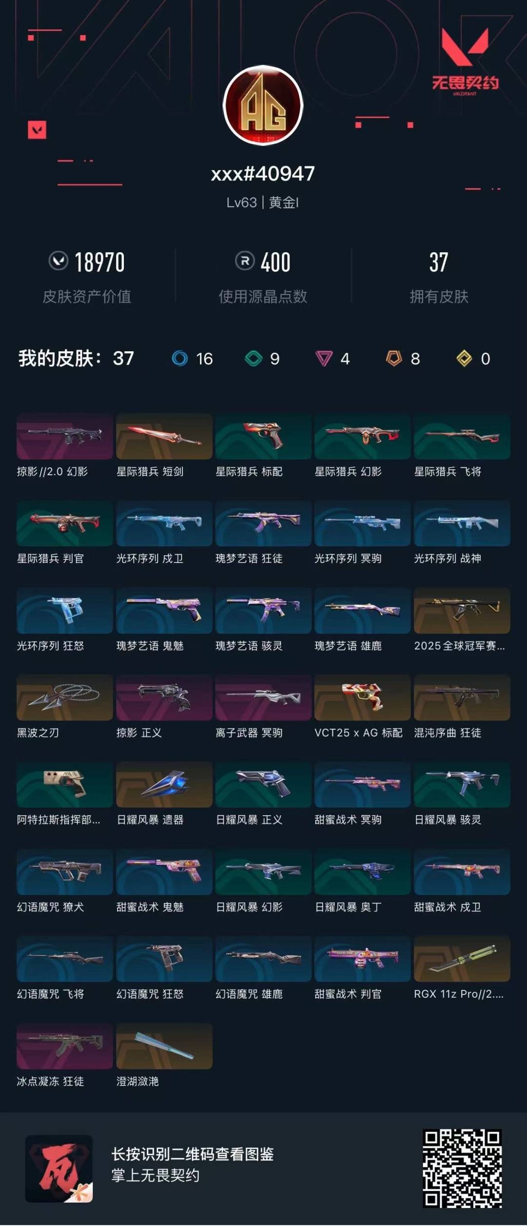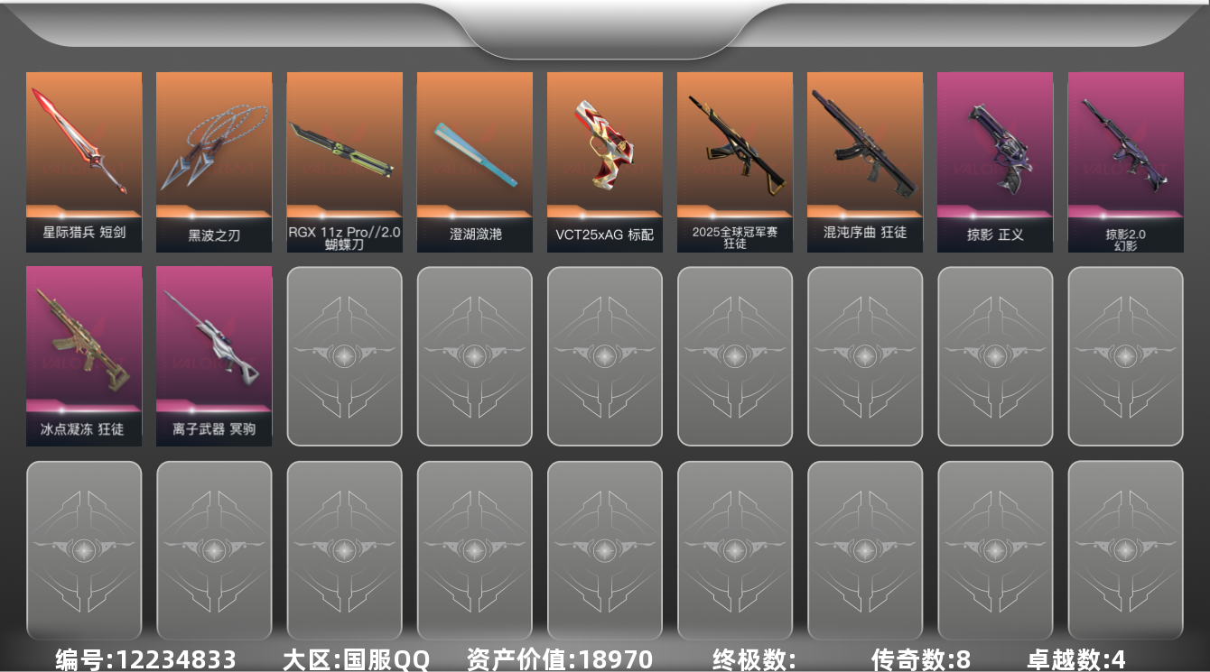 [12234833]8橙皮 4紫皮 37皮肤 17英雄 44卡面 400已用源晶 黄金 优质装备:狂徒-混沌序曲,冥驹-离子武器,正义-掠影,澄湖潋滟,狂徒-冰点凝冻,黑波之刃,RGX 11z Pro//2.0 蝴蝶刀,星际猎兵 短剑,2025全球冠军赛 狂徒 佩枪皮肤:标配-VCT25xAG 步枪皮肤:幻影-掠影2.0