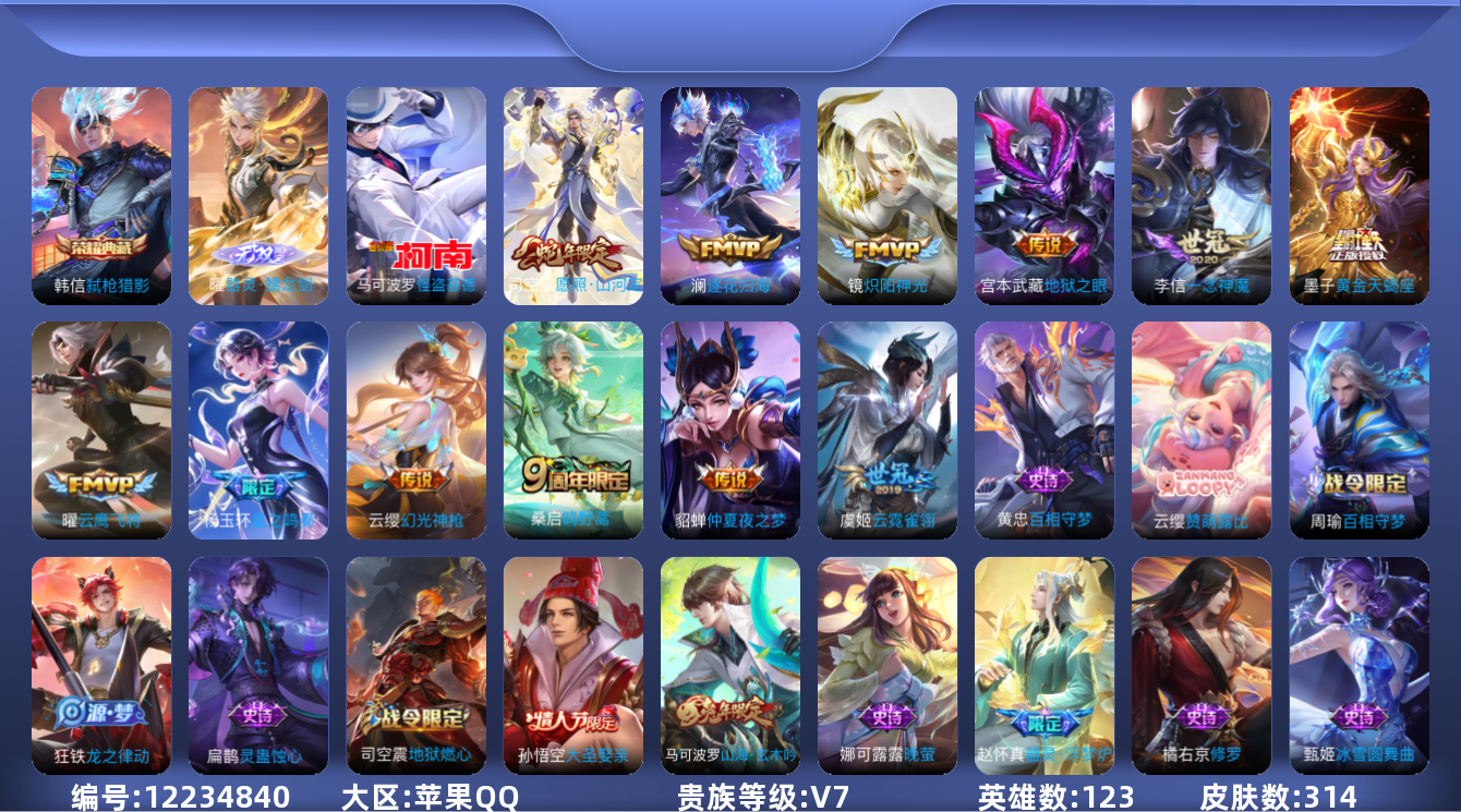 [12234840]V7 1典藏 1无双 1珍品传说 12传说 123英雄 314皮肤 可修改实名 优质装备:弑枪猎影(韩信典藏),器灵·螭龙剑,怪盗基德,云鹰飞将(小将军),炽阳神光,一念神魔,云霓雀翎,仲夏夜之梦(大飞蛾),地狱之眼,澜逐花归海,黄金天蝎座 传说皮:星之鸣奏,幻光神枪 珍宝阁皮:蔷薇恋人,女武神 限定皮:愿照·山河定(司空震年限),逐霄战戟,鸣野蒿,遇见飞天,五谷丰年,梁祝,逐梦之音,李小龙,大圣娶亲,山海·玄木吟(马可年限) 史诗皮:赞萌露比,器灵·浮梦炉,灵蛊蚀心,星界战将,龙之律动,百相守梦-周瑜,怒海争锋,破空之剑,琥珀纪元伽罗,蔬乡物语(鲁班七号),百相守梦-百里守约,百相守梦-黄忠,紫霞仙子,苍穹之光,电玩小子(小书包),黄金分割率,特工魅影,千年之狐,永昼,江河有灵,末日机甲-莱西奥,雪夜绮愿(周瑜),百解令(蒙犽),高渐离燃音魔法,蒙恬荣光圣徽,无限星赏官,青蛇,偶像歌手,晚萤,电玩·爆裂旋风,末日机甲-吕布,猫狗日记-孙策,猫狗日记-大乔,时之恋人-孙尚香,乱世虎臣,节奏热浪,修罗,女仆咖啡,摇滚巨星,水果甜心,绅士熊喵,天才门将,星夜王子,心灵骇客,功夫厨神,德古拉伯爵,暗隐猎兽者,幽灵船长,鬼剑武藏,心灵战警,天秀·启明,舞动绿茵,地狱岩魂,纤云弄巧,繁星吟游(呼啦呼啦),拒霜思,缤纷独角兽,乘风破浪,逐浪之夏,月团寄思,水晶猎龙者,曙光守护者,箭羽风息,金属风暴,原初追逐者,圣诞狂欢,圣诞恋歌,鹰眼统帅,魅力维加斯,黎明之约,无心,未来纪元-赵云