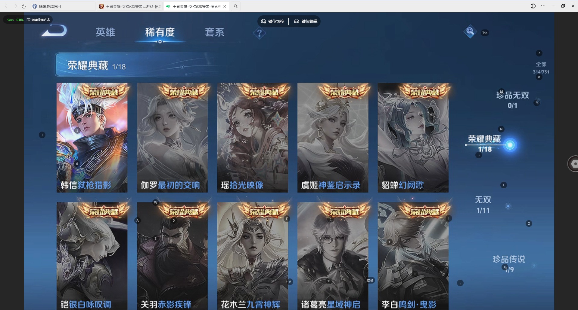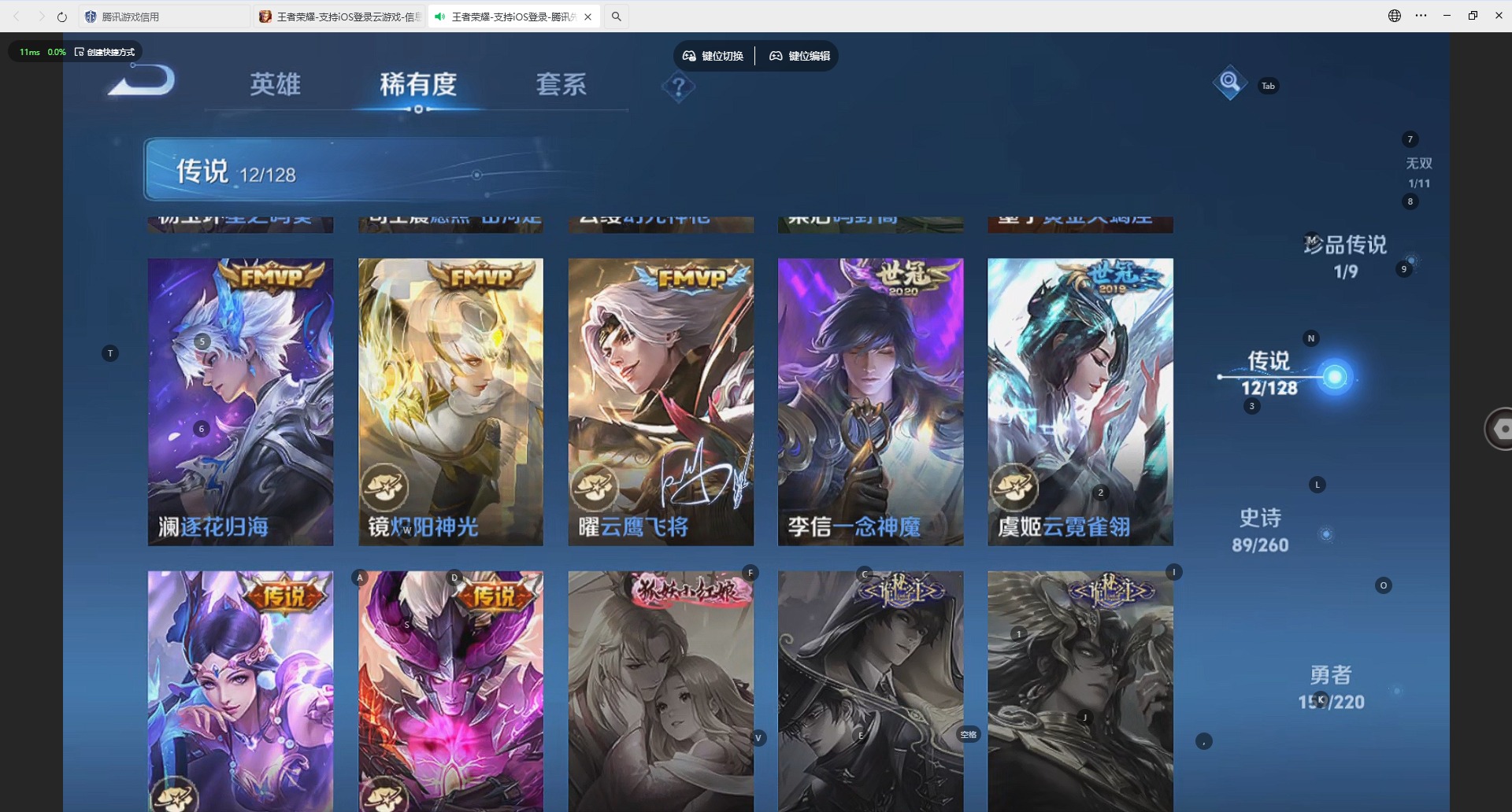 - [11232349]V7 9传说 124英雄 212皮肤 可修改实名 优质装备:一念神魔,地狱火,山海·苍雷引(电光曜子) 传说皮:幻光神枪 珍宝阁皮:胡桃夹子,蔷薇恋人,玩趣恶龙 限定皮:愿照·九州拓(澜年限),愿照·山河定(司空震年限),逐霄战戟,鸣野蒿,怒海麟威,五谷丰年,梁祝,李小龙,朱雀志(守约年限),枫霜尽,山海·玄木吟(马可年限) 史诗皮:器灵·浮梦炉,化蝶舞,龙之律动,百相守梦-百里守约,紫霞仙子,苍穹之光,电玩小子(小书包),千年之狐,冰冠公主,末日机甲-吕布,猫狗日记-孙策,时之恋人-孙尚香,乱世虎臣,节奏热浪,女仆咖啡,摇滚巨星,水果甜心,功夫厨神,德古拉伯爵,暗隐猎兽者,幽灵船长,鬼剑武藏,暗渊魔法,心灵战警,舞动绿茵,地狱岩魂,缤纷独角兽,乘风破浪,逐浪之夏,水晶猎龙者,曙光守护者,箭羽风息,金属风暴,圣诞狂欢,圣诞恋歌,鹰眼统帅,魅力维加斯,赏金猎手,无心,未来纪元-赵云
