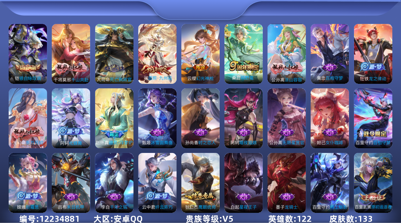 - PX_2100239-实名: 可修改 贵族等级: V5 英雄数: 110 皮肤数: 74 传说皮: 一念神魔,澜逐花归海 限定皮: 五谷丰年
