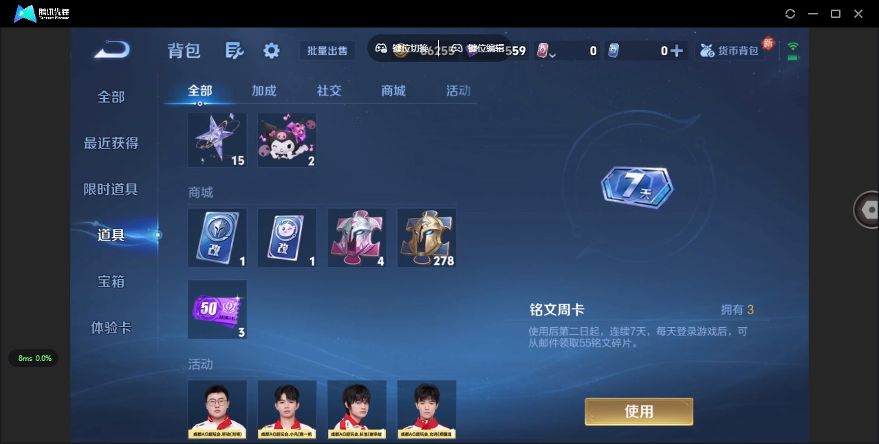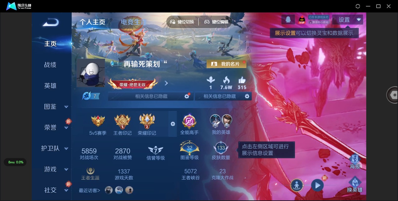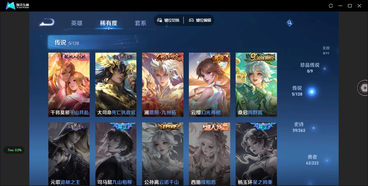- [11744192]V6 4传说 75英雄 65皮肤 可修改实名 优质装备:超时空战士-狄仁杰,涂山容容 传说皮:幻光神枪 限定皮:愿照·九州拓(澜年限),愿照·众生和(妲己年限),山海·玄木吟(马可年限) 史诗皮:鸭鸭历险记-刘禅,苍鳞隐世,器灵·浮梦炉,狼魂孤将,化蝶舞,茶境仙,百相守梦-百里守约,紫霞仙子,电玩小子(小书包),偶像歌手,修罗,心灵骇客,功夫厨神,德古拉伯爵,暗隐猎兽者,幽灵船长,乘风破浪,鹰眼统帅,魅力维加斯