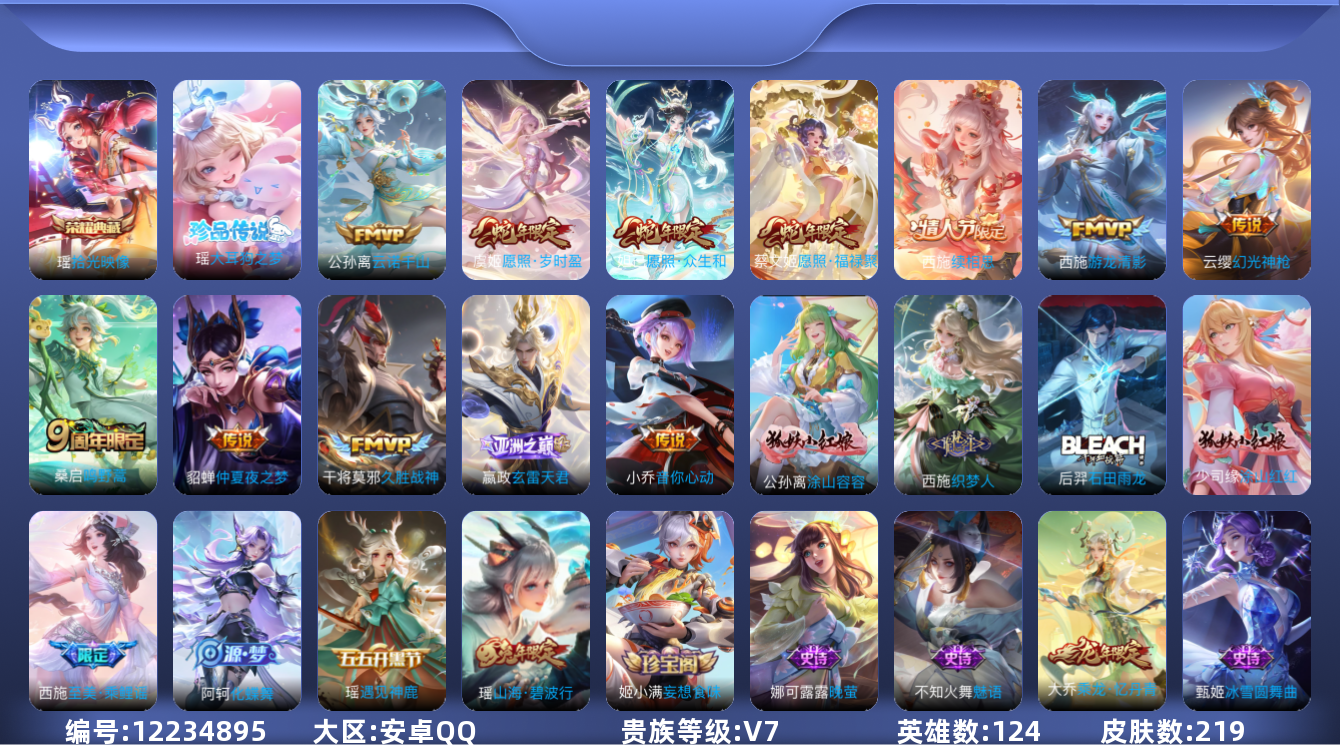 [12234895]V7 1典藏 1珍品传说 12传说 124英雄 219皮肤 可修改实名 女号 优质装备:拾光映像(瑶典藏),大耳狗之梦,久胜战神,仲夏夜之梦(大飞蛾),音你心动-小乔,游龙清影(小青龙),玄雷天君,涂山容容 传说皮:云诺千山,续相思,幻光神枪 珍宝阁皮:妄想食味,优雅恋人,蔷薇恋人 限定皮:愿照·福禄聚(蔡文姬年限),愿照·岁时盈(虞姬年限),愿照·众生和(妲己年限),鸣野蒿,时之彼端,山海·碧波行(瑶年限),至美·乘鲤谣,五谷丰年,神器·万象笔 史诗皮:化蝶舞,谪仙醉月,石田雨龙,茶境仙,破空之剑,涂山红红,蒙犽顽岩魄,芈月浮光幕影,蔬乡物语(鲁班七号),乘龙·忆丹青(大乔年限),百相守梦-百里守约,星界特工,织梦人,遇见神鹿,紫霞仙子,电玩小子(小书包),江河有灵,魅语,百解令(蒙犽),高渐离燃音魔法,无限星赏官,冰冠公主,青蛇,白蛇,晚萤,末日机甲-吕布,猫狗日记-孙策,猫狗日记-大乔,乱世虎臣,节奏热浪,女仆咖啡,水果甜心,星夜王子,心灵骇客,功夫厨神,德古拉伯爵,暗隐猎兽者,鬼剑武藏,心灵战警,舞动绿茵,诗语江南,纤云弄巧,拒霜思,缤纷独角兽,乘风破浪,水晶猎龙者,曙光守护者,唤灵魅影,原初追逐者,圣诞恋歌,鹰眼统帅,暗夜贵公子,魅力维加斯,无心,未来纪元-赵云