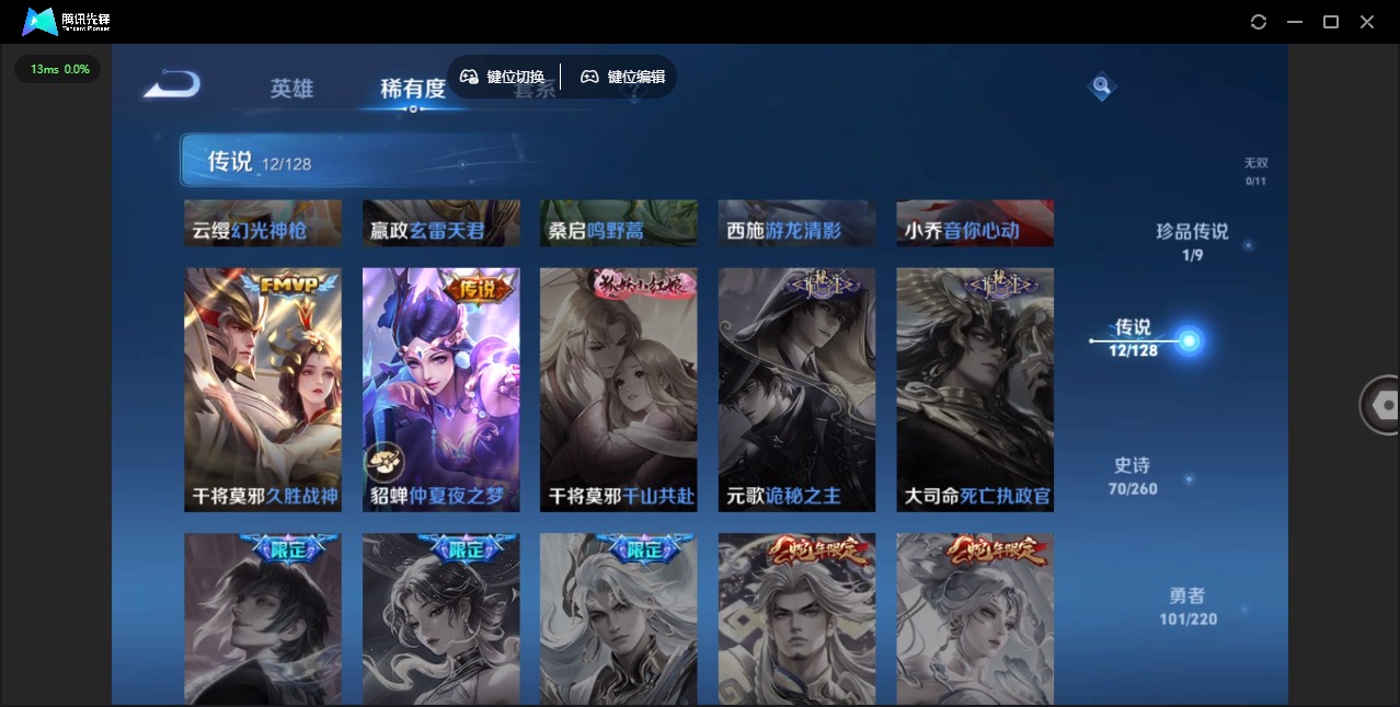 - [11519093]V6 1传说 116英雄 135皮肤 可修改实名 优质装备:淬星耀世 限定皮:至尊宝,飞衡(韩信年限),遇见飞天,梁祝,天狼溯光者,天狼绘梦者,李小龙,逐梦之影,如梦令-后羿,乒乒小将 史诗皮:黄金分割率,特工魅影,千年之狐,暗夜猫娘,魅语,冰冠公主,修罗,水果甜心,功夫厨神,暗隐猎兽者,繁星吟游(呼啦呼啦),水晶猎龙者,曙光守护者,原初追逐者,鹰眼统帅,未来纪元-赵云