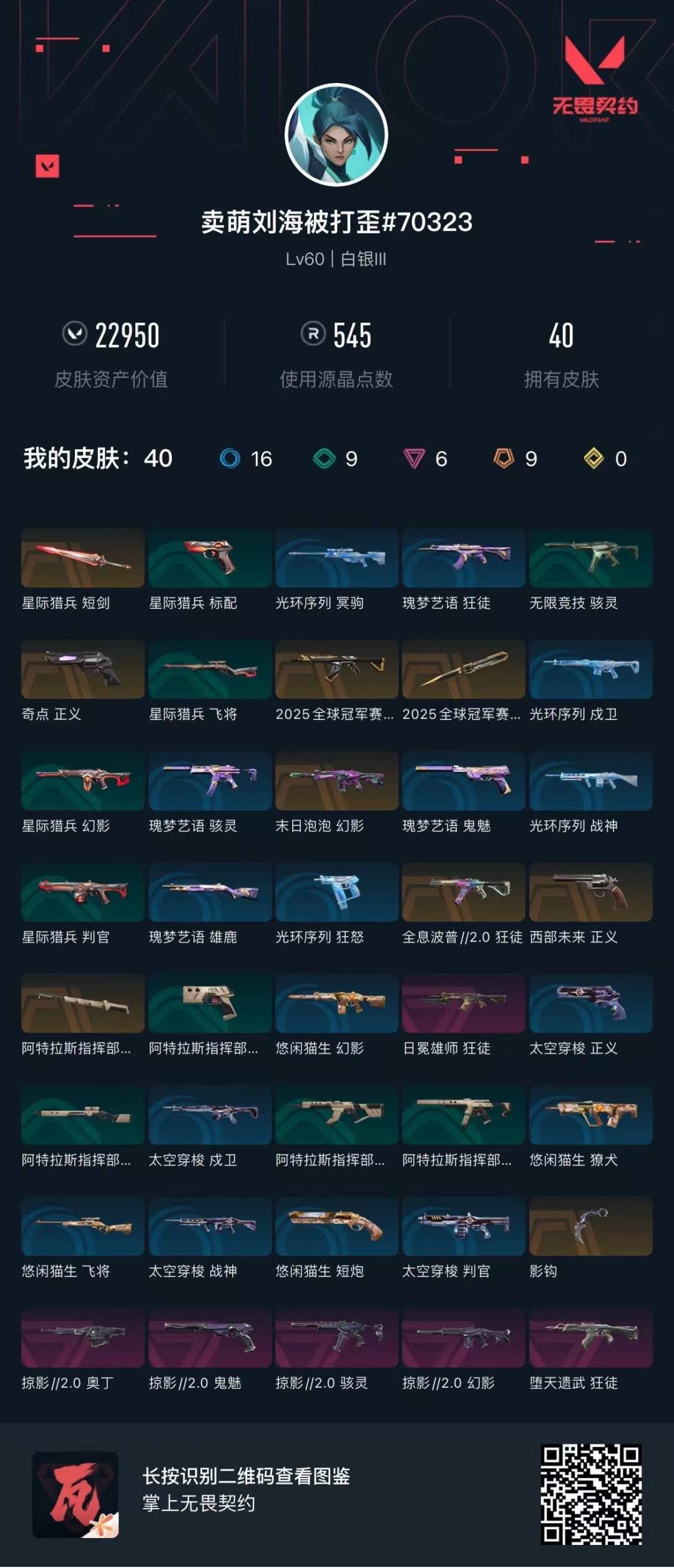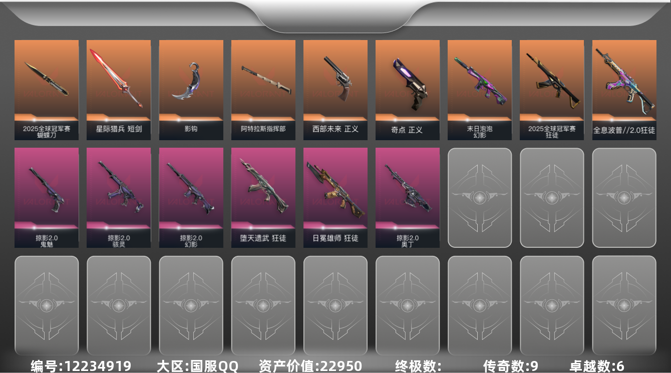 [12234919]9橙皮 6紫皮 40皮肤 17英雄 52卡面 545已用源晶 白银 优质装备:2025全球冠军赛 蝴蝶刀,正义-奇点,狂徒-日冕雄师,狂徒-全息波普//2.0,阿特拉斯指挥部,影钩,幻影-末日泡泡,星际猎兵 短剑,2025全球冠军赛 狂徒 套装:掠影2.0套装 佩枪皮肤:鬼魅-掠影2.0,正义-西部未来 冲锋枪皮肤:骇灵-掠影2.0 步枪皮肤:幻影-掠影2.0,狂徒-堕天遗武 机枪皮肤:奥丁-掠影2.0