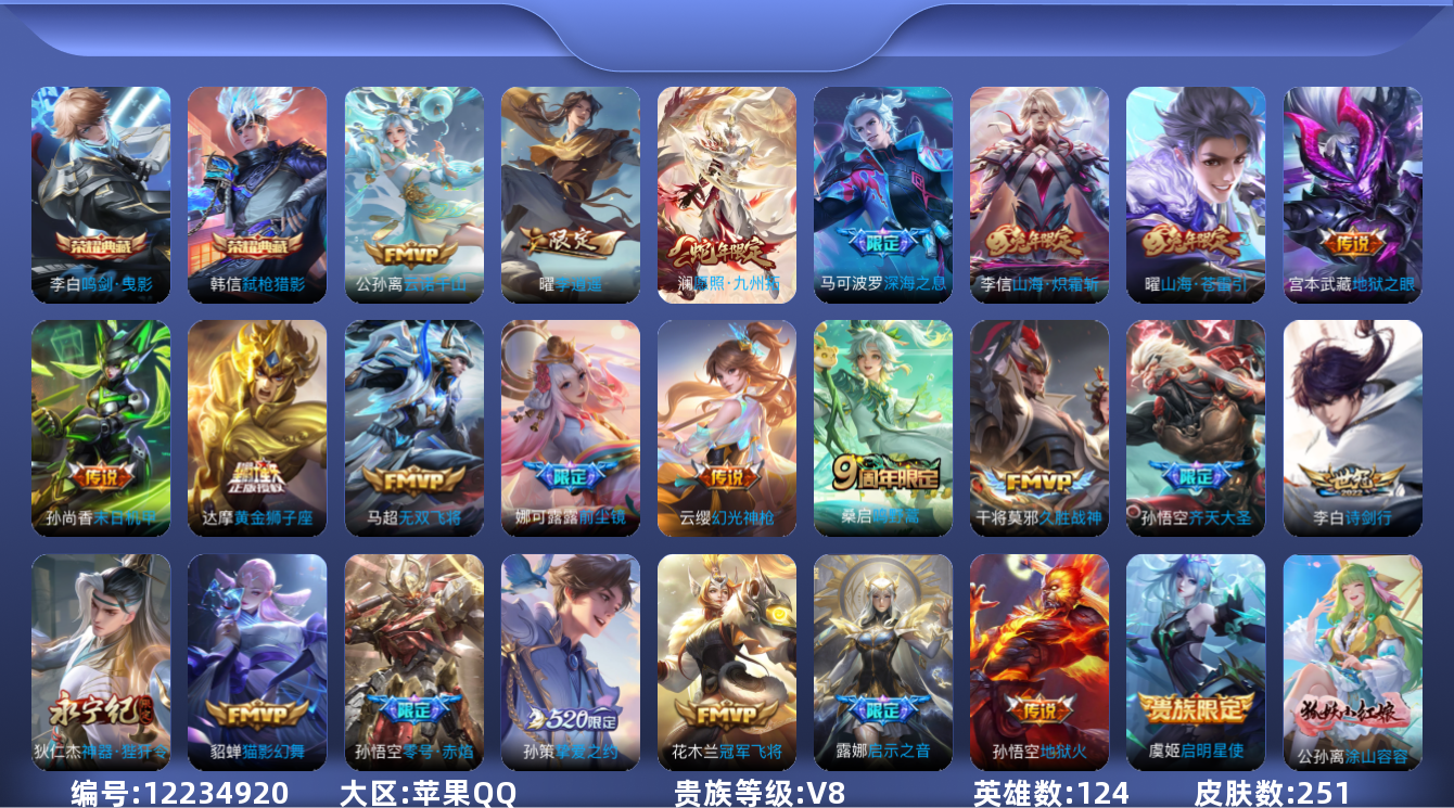 [12234920]V8 2典藏 24传说 124英雄 251皮肤 可修改实名 优质装备:鸣剑·曳影,弑枪猎影(韩信典藏),黄金狮子座,冠军飞将,猫影幻舞,久胜战神,末日机甲-孙尚香(绿蚂蚱),地狱火,零号·赤焰,地狱之眼,李逍遥,挚爱之约,无双飞将,神器·狴犴令,山海·炽霜斩(李信年限),山海·苍雷引(电光曜子),涂山容容 传说皮:云诺千山,幻光神枪 珍宝阁皮:妄想食味,蔷薇恋人 限定皮:愿照·九州拓(澜年限),鸣野蒿,傲雪梅枪,前尘镜,遇见飞天,高山流水,诗剑行,齐天大圣,匿光决锋者,降魔,五谷丰年,青龙志(铠年限),孙行者,匿光追影者,时之祈愿-云中君,百木心枪,玉兔公主,启示之音,深海之息(深海大菠萝),山海·玄木吟(马可年限) 史诗皮:器灵·浮梦炉,星界战将,龙之律动,石田雨龙,蒙犽顽岩魄,星界特工,百相守梦-黄忠,遇见神鹿,紫霞仙子,电玩小子(小书包),特工魅影,千年之狐,永昼,江河有灵,魅语,蒙恬荣光圣徽,无限星赏官,偶像歌手,晚萤,电玩·爆裂旋风,末日机甲-吕布,猫狗日记-孙策,乱世虎臣,节奏热浪,修罗,摇滚巨星,水果甜心,绅士熊喵,星夜王子,心灵骇客,功夫厨神,德古拉伯爵,鬼剑武藏,心灵战警,乐园奇幻夜,地狱岩魂,缤纷独角兽,乘风破浪,逐浪之夏,龙鼓争鸣,水晶猎龙者,曙光守护者,金属风暴,原初追逐者,鹰眼统帅,暗夜贵公子,魅力维加斯,黎明之约,赏金猎手,天秀·音浪,滕王阁序,无心,未来纪元-赵云