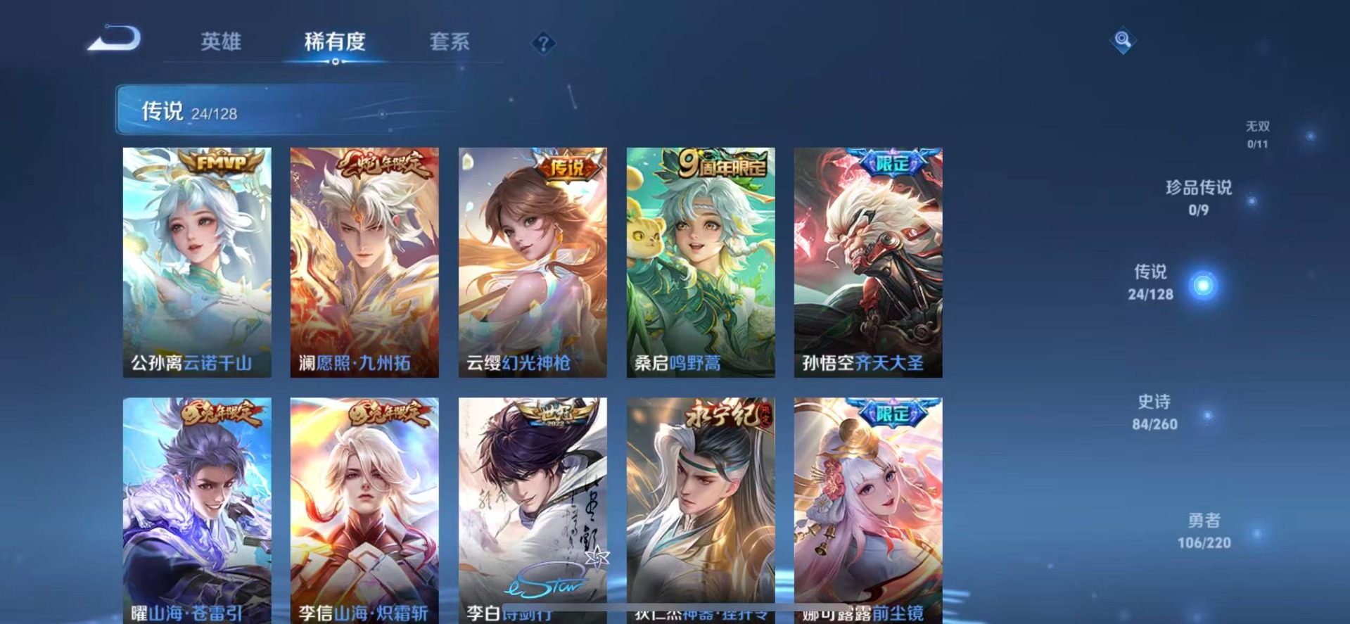 - [11883448]V5 1珍品传说 3传说 52英雄 40皮肤 可修改实名 嫦娥大国标 杨玉环小国标 夏洛特小国标 优质装备:器灵·落星盏,地狱之眼,浮生妄 传说皮:典韦战鼓燎原 史诗皮:鸭鸭历险记-刘禅,龙之律动,茶境仙,星夜王子,乘风破浪,鹰眼统帅,魅力维加斯