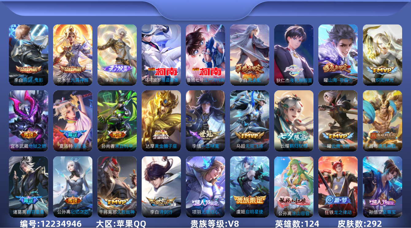 [12234946]V8 2典藏 1无双 2珍品传说 19传说 124英雄 292皮肤 可修改实名 优质装备:鸣剑·曳影,九霄神辉(木兰典藏),碎月剑心(李白无双),江户川柯南,怪盗基德,黄金狮子座,云鹰飞将(小将军),久胜战神,炽阳神光,一念神魔,末日机甲-孙尚香(绿蚂蚱),地狱之眼,无双飞将,山海·苍雷引(电光曜子),浮生妄,记忆之芯(机甲兔),鹤羽星尊,鹤归松栖(云缨),遇见神鼓,夜礼服假面,涂山容容 珍宝阁皮:万物之道,优雅恋人,女武神 限定皮:至尊宝,凤求凰(白切鸡),傲雪梅枪,神威(电光马子),无限倾心-项羽,高山流水,诗剑行,五谷丰年,梁祝,岱宗(典韦年限),天狼征服者,李小龙,如梦令-后羿,孙行者,猪悟能,山海·玄木吟(马可年限) 史诗皮:器灵·浮梦炉,星界战将,龙之律动,琥珀纪元伽罗,蔬乡物语(鲁班七号),紫霞仙子,电玩小子(小书包),白龙吟,黄金分割率,特工魅影,千年之狐,江河有灵,魅语,百解令(蒙犽),蒙恬荣光圣徽,无限星赏官,匿光破解者,偶像歌手,晚萤,电玩·爆裂旋风,百相守梦(关羽),猫狗日记-孙策,乱世虎臣,节奏热浪,修罗,摇滚巨星,水果甜心,绅士熊喵,天才门将,星夜王子,功夫厨神,德古拉伯爵,暗隐猎兽者,幽灵船长,鬼剑武藏,暗渊魔法,心灵战警,舞动绿茵,地狱岩魂,纤云弄巧,缤纷独角兽,乘风破浪,逐浪之夏,月团寄思,水晶猎龙者,曙光守护者,热力回旋,箭羽风息,金属风暴,圣诞狂欢,圣诞恋歌,鹰眼统帅,黎明之约,赏金猎手,无心,玫瑰异探
