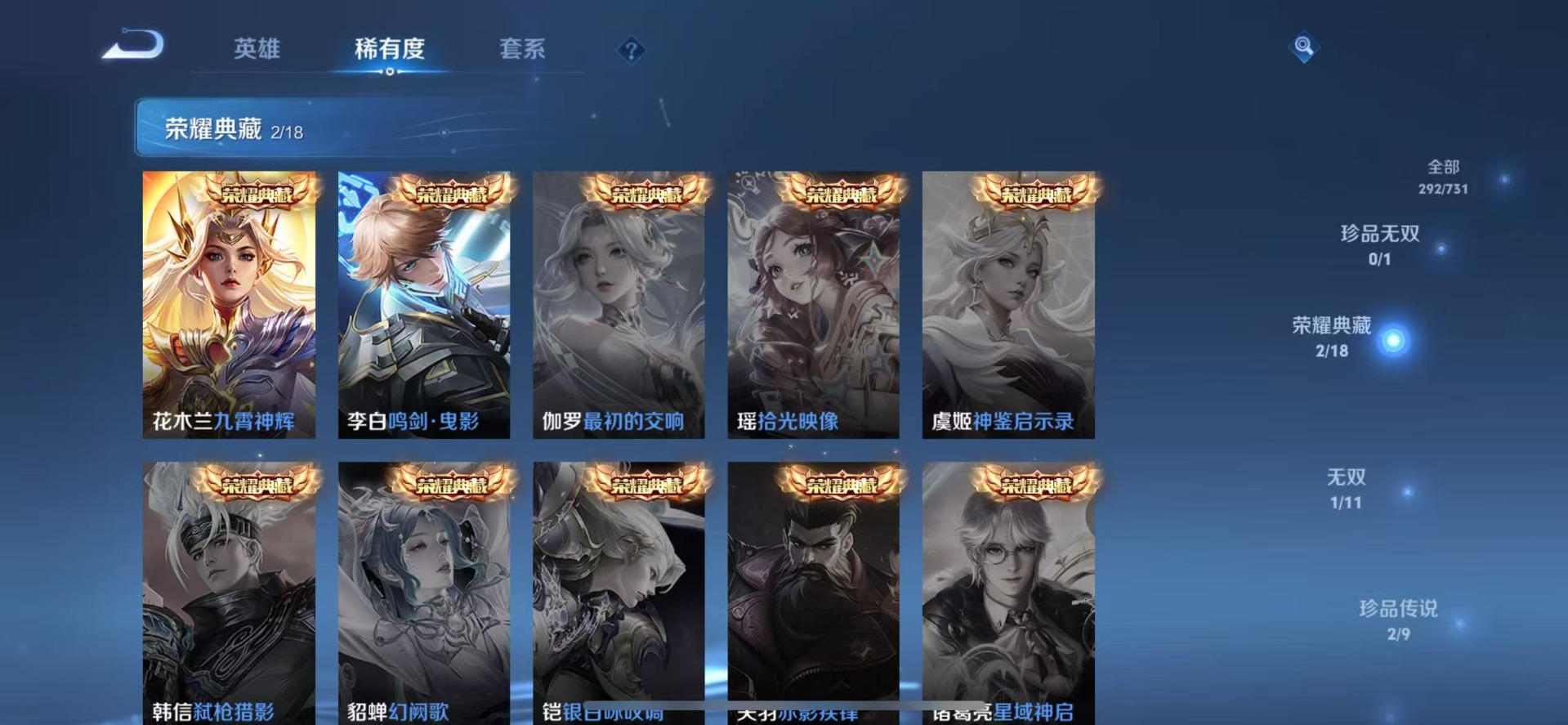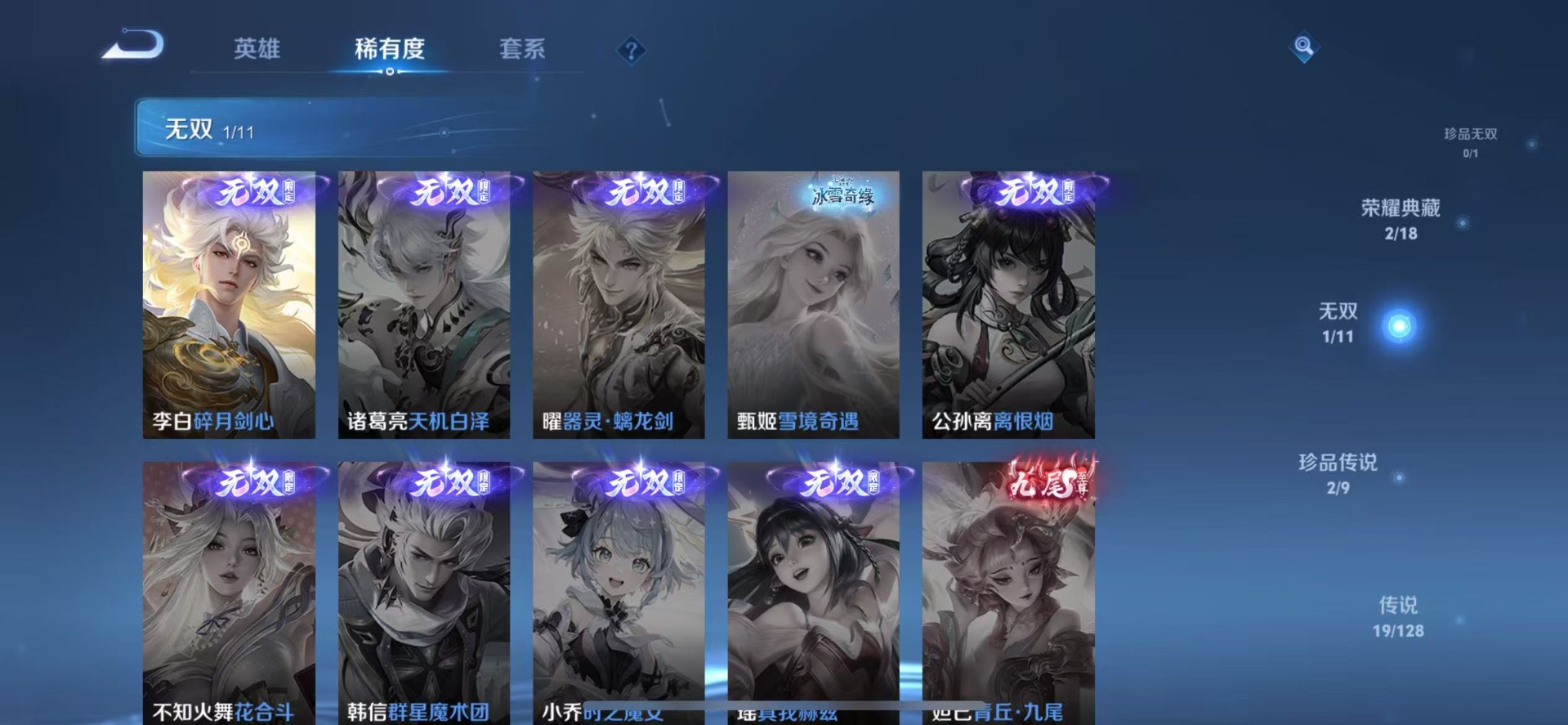 - PX_2056617-24 安卓QQ/无双王者/316皮肤/125英雄/3典藏/0珍品无双/0无双/2珍品传说/17传说/89史诗/9稀有英雄 【2 珍品传说】大耳狗之梦 瑶,器灵·落星盏 嫦娥, 【3 典藏皮肤】鸣剑·曳影 李白,全息碎影 孙悟空,拾光映像 瑶, 【17 传说皮肤】胖达荣荣 梦奇,启明星使 虞姬,云鹰飞将 曜,炽阳神光 镜,乘龙·问璇玑 孙尚香,时之恋人 刘备,乘龙·淬吴钩 孙策