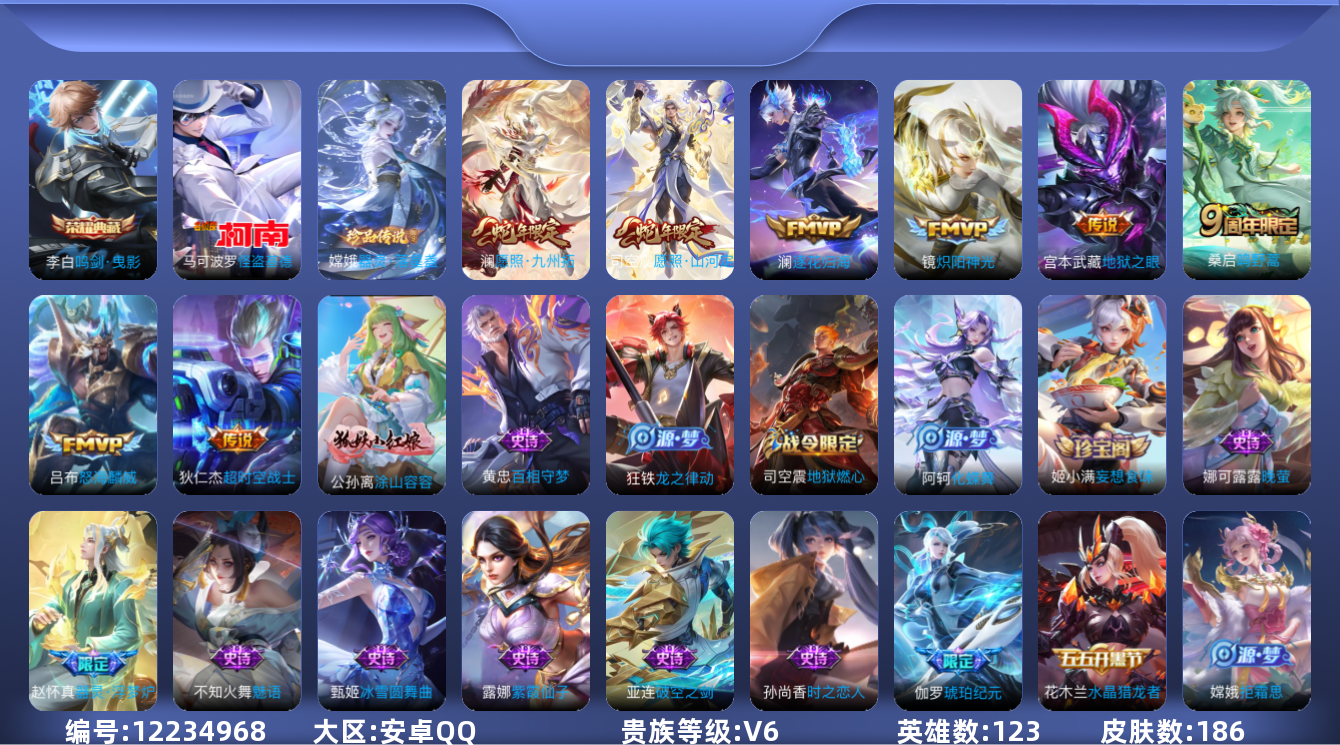 [12234968]V6 1典藏 2珍品传说 8传说 123英雄 186皮肤 可修改实名 优质装备:鸣剑·曳影,怪盗基德,器灵·落星盏,炽阳神光,地狱之眼,超时空战士-狄仁杰,澜逐花归海,涂山容容 珍宝阁皮:妄想食味 限定皮:愿照·九州拓(澜年限),愿照·山河定(司空震年限),逐霄战戟,鸣野蒿,怒海麟威 史诗皮:器灵·浮梦炉,化蝶舞,星界战将,龙之律动,破空之剑,蒙犽顽岩魄,琥珀纪元伽罗,百相守梦-黄忠,紫霞仙子,特工魅影,千年之狐,江河有灵,魅语,蒙恬荣光圣徽,白蛇,晚萤,猫狗日记-孙策,猫狗日记-大乔,时之恋人-孙尚香,乱世虎臣,节奏热浪,摇滚巨星,水果甜心,星夜王子,功夫厨神,暗隐猎兽者,幽灵船长,鬼剑武藏,地狱岩魂,纤云弄巧,拒霜思,乘风破浪,逐浪之夏,水晶猎龙者,原初追逐者,圣诞狂欢,鹰眼统帅,魅力维加斯,未来纪元-赵云