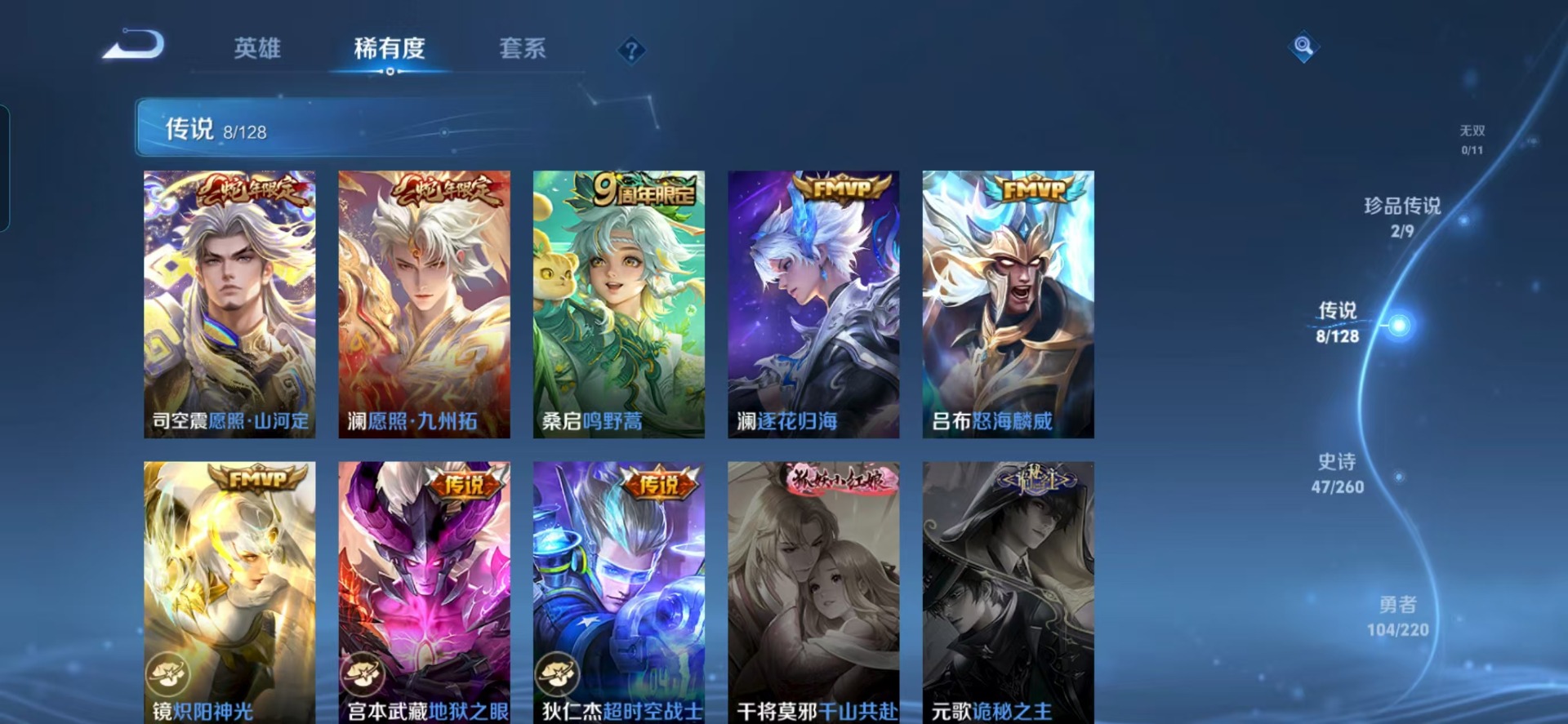 - [12296663]V10 6典藏 1无双 2珍品传说 28传说 126英雄 363皮肤 典藏英雄武则天 可修改实名 优质装备:天鹅之梦(小乔典藏),无限飓风号(高达),杀手不太冷,大秦宣太后,全息碎影(猴子典藏),神鉴启示录,韩信群星魔术团(韩信无双),朽木白哉,黑崎一护,黄金狮子座,黄金射手座,绛天战甲(鸡嘴战神),黄金白羊座,久胜战神,炽阳神光,云霓雀翎,末日机甲-孙尚香(绿蚂蚱),地狱火,仲夏夜之梦(大飞蛾),零号·赤焰,海洋之心,地狱之眼,胖达荣荣,时之恋人-刘备(电焊工),超时空战士-狄仁杰,艾琳觅芳踪 传说皮:云诺千山,幻光神枪 珍宝阁皮:优雅恋人,女武神 限定皮:愿照·山河定(司空震年限),鸣野蒿,白虎志(电光耗子),凤求凰(白切鸡),太华(伽罗年限),时之彼端,魔法小厨娘,神威(电光马子),飞衡(韩信年限),玄嵩(庄周年限),五谷丰年,幽恒(沐浴露),武圣,梁祝,天狼狩猎者,龙胆,烈魂,岱宗(典韦年限),虎魄,天狼征服者,李小龙,永曜之星,如梦令-嫦娥,如梦令-后羿,孙行者,天魔缭乱,神奇女侠 史诗皮:鸭鸭历险记-刘禅,化蝶舞,灵蛊蚀心,龙之律动,雪豹·霜爪,布丁狗之誓,石田雨龙,百相守梦-黄忠,织梦人,遇见神鹿,紫霞仙子,苍穹之光,电玩小子(小书包),白龙吟,黄金分割率,特工魅影,千年之狐,魅语,无限星赏官,冰冠公主,青蛇,偶像歌手,晚萤,暗夜猫娘,龙骑士(小龙虾),末日机甲-吕布,猫狗日记-孙策,猫狗日记-大乔,乱世虎臣,节奏热浪,修罗,女仆咖啡,摇滚巨星,水果甜心,绅士熊喵,天才门将,星夜王子,心灵骇客,功夫厨神,德古拉伯爵,暗隐猎兽者,幽灵船长,鬼剑武藏,心灵战警,舞动绿茵,地狱岩魂,诗语江南,纤云弄巧,繁星吟游(呼啦呼啦),缤纷独角兽,乘风破浪,逐浪之夏,月团寄思,水晶猎龙者,曙光守护者,箭羽风息,金属风暴,原初追逐者,圣诞狂欢,圣诞恋歌,鹰眼统帅,暗夜贵公子,魅力维加斯,黎明之约,未来纪元-赵云