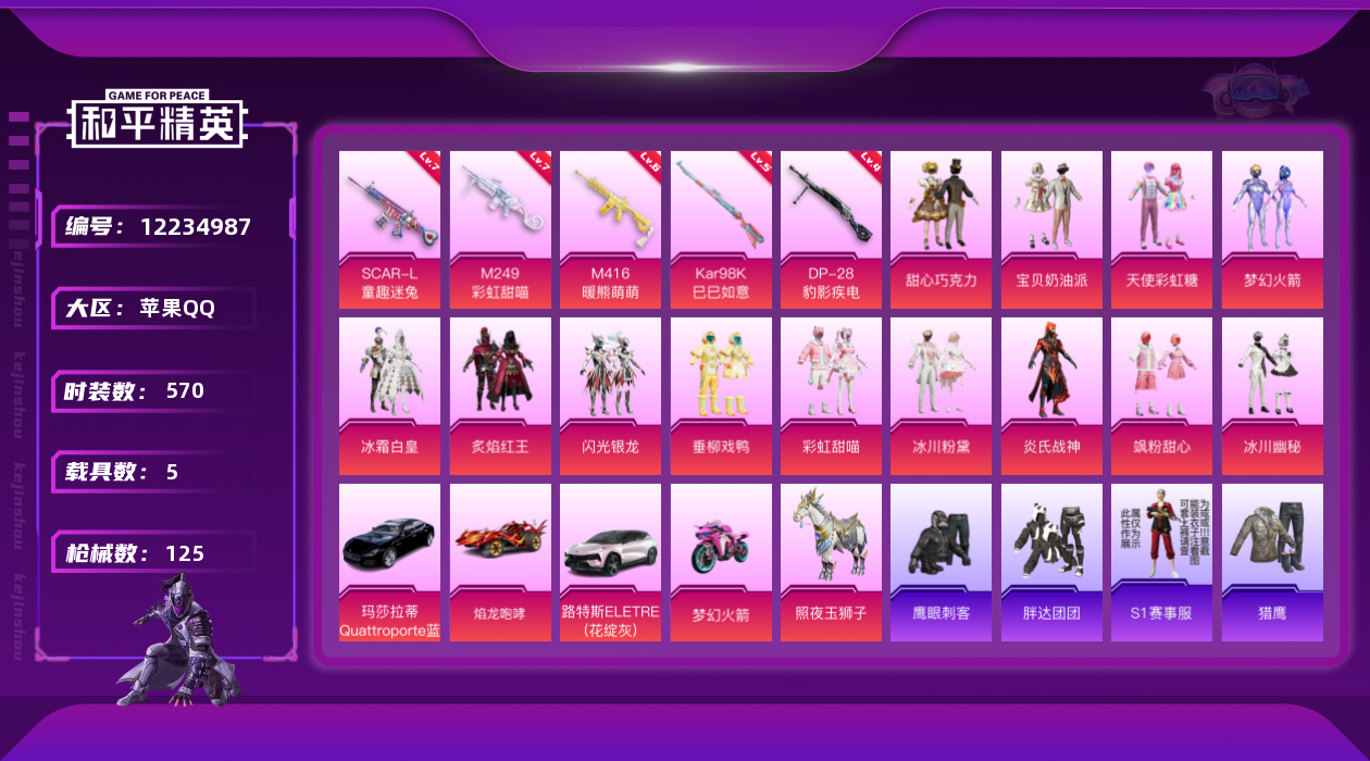 [12234987]13粉装 5特效枪 5载具 10印记 可二次 可修改实名 优质装备:甜心巧克力,焰龙咆哮,路特斯ELETRE(花绽灰),玛莎拉蒂Quattroporte(夜幕蓝),梦幻火箭(新101)(新火箭少女101粉色套装),宝贝奶油派,天使彩虹糖,SCAR-L童趣迷兔,炙焰红王,冰霜白皇,M416暖熊萌萌,M249彩虹甜喵(M249-彩虹甜喵),七级M249-彩虹甜喵,七级SCAR-L-童趣迷兔,Kar98K-巳巳如意 热门装扮:闪光银龙,垂柳戏鸭,彩虹甜喵,冰川粉黛,冰川幽秘,飒粉甜心,炎氏战神,S1赛事上衣,胖达团团,鹰眼刺客 载具:双人摩托-梦幻火箭,照夜玉狮子 稀有枪皮:DP-28-豹影疾电 六级特效枪:六级M416-暖熊萌萌 五级特效枪:五级Kar98K-巳巳如意 四级特效枪:四级DP-28-豹影疾电 紫色装扮:田园牧歌,轻风白浪,SS22特训,SS23特训,苍岚星,照水倚天,娇憨猪猪,酸甜橘柚,俏皮奶喵,暖心橘喵,萌趣咩咩,暖心熊熊,SS21特训,SS31特训套装,SS3特训,SS5特训,人气偶像,军械专家,冰川特警,决胜时刻,冷焰舞者,北国孤狼,SS30特训套装,SS33特训套装,SS20特训,微雨春柳,暖风夏荷,猎梦纪元,吉莉礼服,甜心亚梦,虚音幻奏,都市魅力,酒红色名流,野性战魂,长空猛禽,雪山精英,青年教官,迎春赐吉,花园小羊咩,蓝彩潮人,蓝色运动,街头潮人,飞行日记,龙腾端午,魅力单车,鹤鸣,麻辣教官,黄色伏地魔,黄色名流,黄色运动,黎明保卫者,黑色伏地魔,龙的传人,龟仙人,冰河战士,龙魂突击队,极地朋克,极速红龙,棕色飞行服,橘黑制服,沙漠兵团,海滨突袭者,深蓝色名流,幻影武者,坚韧舞者,夜莺强袭者,完美偶像,帅气教官,幻世战舞者,战地名士,战地督导,探宝勇士,湖蓝色名流,绮丽涂鸦,疯狂小兔子,登山爱好者,白色伏地魔,破晓战魂,破蛋小黄鸡,碟中谍A款,游猎者,福星高照,竞技达人朋克,红色运动,甜蜜熊情侣,牛气冲天,灼焰舞者,牛气满满,猛禽,猎鹰,SS29特训,星途旅人,SS28特训,玉兔迎春,巳巳如意,竞技名士,街头风暴,惊鸿侠骨,SS24特训(SS24特训套装),SS25特训,元气发射,金戈铁马,锦衣飞扬,SS27特训,浪漫天命,华灯初上,忠猛周仓,晨曦薄雾,SS26特训,春光漫游,快闪甜心,SS6特训,SS8特训,SS12特训,纯白誓言,暗夜契约