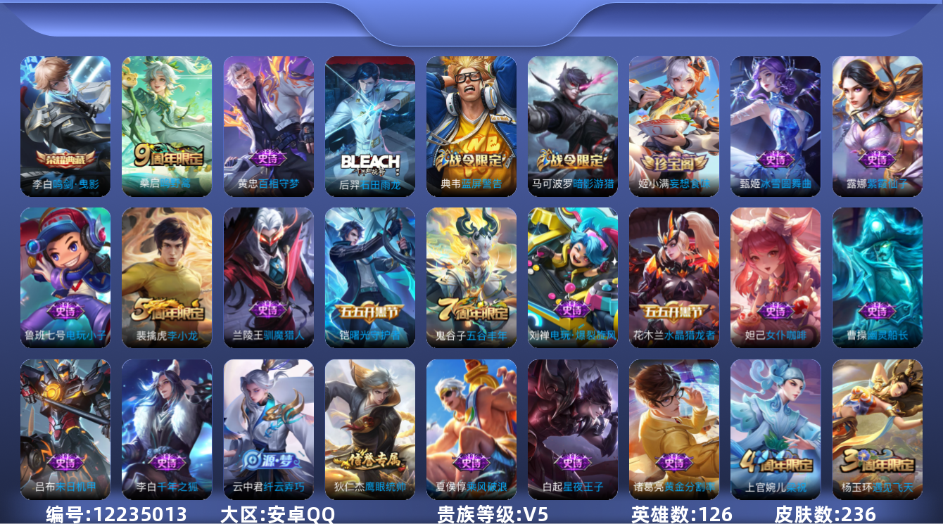 [12235013]V5 1典藏 1传说 126英雄 236皮肤 可修改实名 优质装备:鸣剑·曳影 珍宝阁皮:妄想食味,女武神 限定皮:鸣野蒿,遇见飞天,五谷丰年,游园惊梦,梁祝,李小龙 史诗皮:星界战将,石田雨龙,百相守梦-黄忠,蒙犽顽岩魄,紫霞仙子,电玩小子(小书包),黄金分割率,千年之狐,冰冠公主,江河有灵,蒙恬荣光圣徽,电玩·爆裂旋风,末日机甲-吕布,乱世虎臣,节奏热浪,女仆咖啡,水果甜心,星夜王子,功夫厨神,德古拉伯爵,幽灵船长,鬼剑武藏,舞动绿茵,纤云弄巧,繁星吟游(呼啦呼啦),缤纷独角兽,乘风破浪,水晶猎龙者,曙光守护者,金属风暴,原初追逐者,圣诞恋歌,鹰眼统帅,暗夜贵公子,魅力维加斯,黎明之约