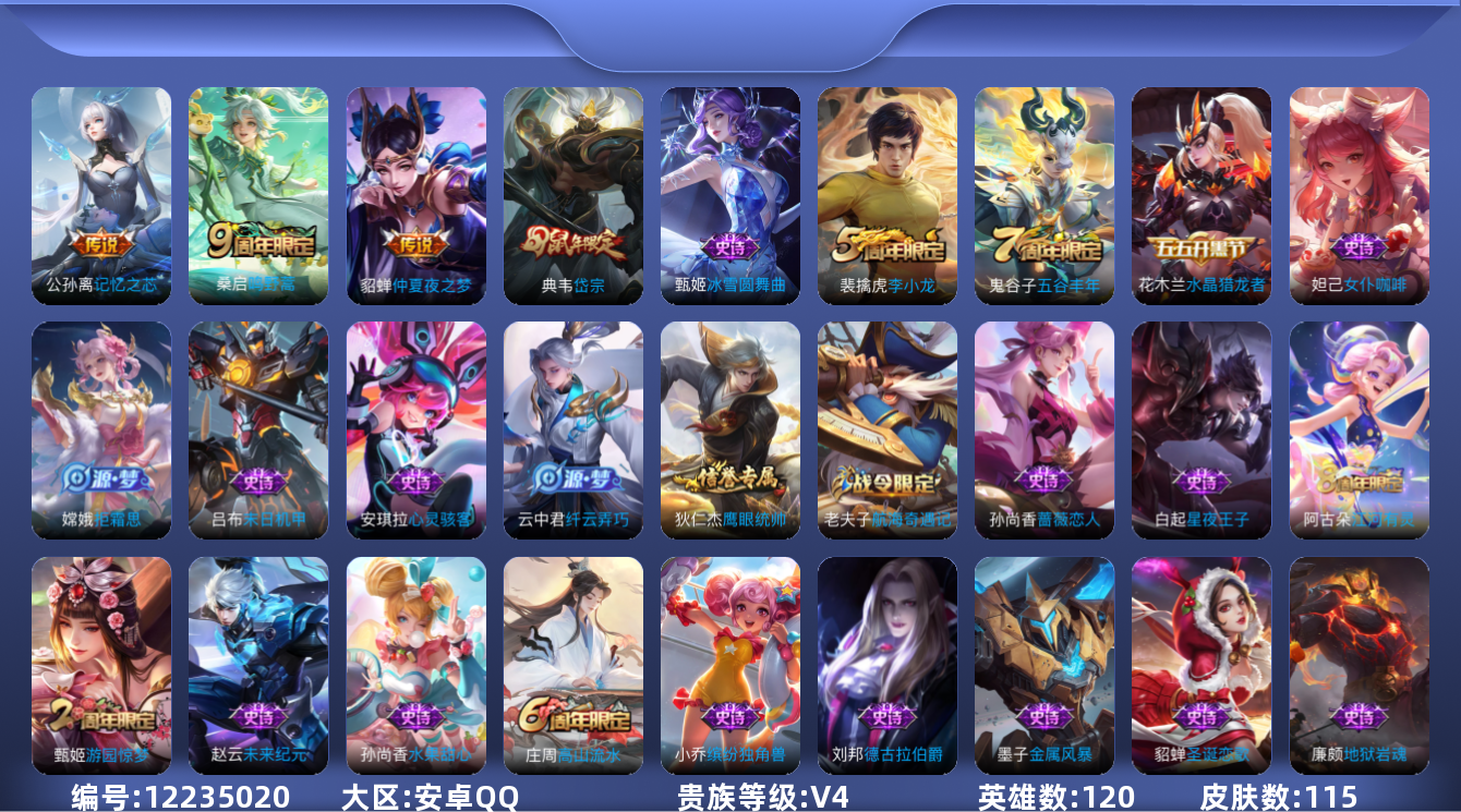 [12235020]V4 3传说 120英雄 115皮肤 可修改实名 优质装备:仲夏夜之梦(大飞蛾),记忆之芯(机甲兔) 珍宝阁皮:胡桃夹子,蔷薇恋人 限定皮:鸣野蒿,高山流水,五谷丰年,游园惊梦,岱宗(典韦年限),李小龙 史诗皮:江河有灵,冰冠公主,末日机甲-吕布,女仆咖啡,水果甜心,绅士熊喵,星夜王子,心灵骇客,功夫厨神,德古拉伯爵,舞动绿茵,地狱岩魂,纤云弄巧,拒霜思,缤纷独角兽,水晶猎龙者,金属风暴,圣诞恋歌,鹰眼统帅,未来纪元-赵云