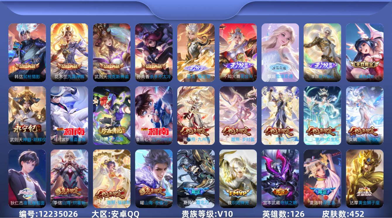[12235026]V10 4典藏 6无双 3珍品传说 47传说 126英雄 452皮肤 典藏英雄武则天 可修改实名 优质装备:倪克斯神谕(宇宙婆娘),杀手不太冷,九霄神辉(木兰典藏),弑枪猎影(韩信典藏),真我赫兹(瑶)(瑶无双),神器·明辉仪,碎月剑心(李白无双),花合斗,雪境奇遇-甄姬,器灵·螭龙剑,江户川柯南,怪盗基德,黄金狮子座,云鹰飞将(小将军),炽阳神光,一念神魔,地狱火,仲夏夜之梦(大飞蛾),零号·赤焰,海洋之心,地狱之眼,飞鸢探春,音你心动-周瑜,乞巧织情,游龙清影(小青龙),超时空战士-狄仁杰,花朝如约(花篮子),音你闪耀(rap皮),神器·明辉仪,山海·炽霜斩(李信年限),山海·琳琅生(小乔年限),山海·苍雷引(电光曜子),画中仙,浮生妄,百相守梦(张飞),电玩·雷克斯,灼幽烈阳,妄想实况,夜礼服假面,艾琳觅芳踪,牧神诗旅,千劫归真 珍品传说:时之奇旅-孙策 传说皮:铠冥王哈迪斯,幻光神枪 珍宝阁皮:妄想食味,胡桃夹子,优雅恋人 限定皮:愿照·九州拓(澜年限),愿照·福禄聚(蔡文姬年限),愿照·岁时盈(虞姬年限),愿照·山河定(司空震年限),愿照·众生和(妲己年限),愿照·千秋盛(女娲年限),逐霄战戟,映山客,陌上桑,鸣野蒿,夏侯惇霜北刀,至尊宝,傲雪梅枪,补天,绯月行,白鹤梁神女,白晶晶,时雨天司(水龙头),神威(电光马子),飞衡(韩信年限),山海·碧波行(瑶年限),至美·乘鲤谣,影龙天霄,遇见飞天,高山流水,诗剑行,齐天大圣,匿光决锋者,五谷丰年,冰锋战神,幽恒(沐浴露),天狼运算者,游园惊梦,梁祝,御风骁将(吕布年限),龙胆,烈魂,岱宗(典韦年限),天狼溯光者,虎魄,天狼征服者,李小龙,朱雀志(守约年限),辉光之辰,霸王别姬-项羽,霸王别姬-虞姬,圣诞老人,默契交锋-花木兰,孙行者,猪悟能,大圣娶亲,引擎之心,青春决赛季,寅虎·御盾(廉颇年限),寅虎·心曲(虎婆),玉兔公主,匿光启智者,神器·万象笔,山海·玄木吟(马可年限) 史诗皮:器灵·浮梦炉,糖绘人间,绮世丹青,化蝶舞,石田雨龙,茶境仙,怒海争锋,撼地雄心,破空之剑,战舞者,蒙犽顽岩魄,埋骨钱,芈月浮光幕影,曹操夜都魔契,百相守梦-百里守约,遇见神鹿,紫霞仙子,苍穹之光,电玩小子(小书包),白龙吟,黄金分割率,特工魅影,千年之狐,永昼,江河有灵,魅语,百解令(蒙犽),高渐离燃音魔法,无限星赏官,冰冠