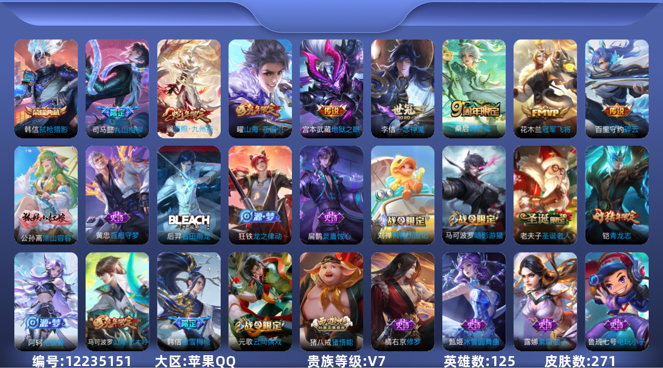 [12235151]V7 1典藏 8传说 125英雄 271皮肤 可修改实名 优质装备:弑枪猎影(韩信典藏),冠军飞将,一念神魔,地狱之眼,碎云,山海·苍雷引(电光曜子),涂山容容 传说皮:九山相柳 珍宝阁皮:万物之道,优雅恋人,玩趣恶龙 限定皮:愿照·九州拓(澜年限),鸣野蒿,傲雪梅枪,高山流水,降魔,五谷丰年,青龙志(铠年限),梁祝,天狼溯光者,逐梦之影,如梦令-后羿,圣诞老人,猪悟能,匿光追影者,山海·玄木吟(马可年限) 史诗皮:鸭鸭历险记-刘禅,化蝶舞,灵蛊蚀心,星界战将,龙之律动,石田雨龙,蒙犽顽岩魄,琥珀纪元伽罗,百相守梦-黄忠,紫霞仙子,电玩小子(小书包),黄金分割率,特工魅影,千年之狐,江河有灵,雪夜绮愿(周瑜),百解令(蒙犽),高渐离燃音魔法,蒙恬荣光圣徽,无限星赏官,偶像歌手,电玩·爆裂旋风,银翎春语,龙骑士(小龙虾),末日机甲-吕布,猫狗日记-孙策,节奏热浪,修罗,女仆咖啡,摇滚巨星,水果甜心,星夜王子,心灵骇客,功夫厨神,德古拉伯爵,暗隐猎兽者,幽灵船长,鬼剑武藏,暗渊魔法,心灵战警,乐园奇幻夜,天秀·启明,舞动绿茵,地狱岩魂,纤云弄巧,拒霜思,乘风破浪,逐浪之夏,月团寄思,水晶猎龙者,曙光守护者,金属风暴,原初追逐者,圣诞狂欢,圣诞恋歌,鹰眼统帅,王者之锤,魅力维加斯,无心,未来纪元-赵云
