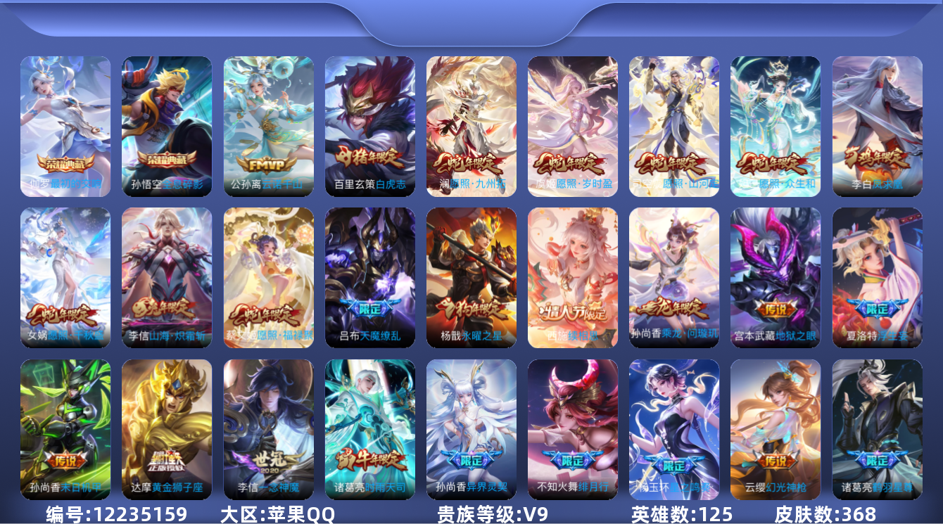 [12235159]V9 2典藏 41传说 125英雄 368皮肤 可修改实名 优质装备:全息碎影(猴子典藏),最初的交响(伽罗典藏),黄金狮子座,黄金射手座,冠军飞将,黄金白羊座,久胜战神,一念神魔,云霓雀翎,末日机甲-孙尚香(绿蚂蚱),地狱火,仲夏夜之梦(大飞蛾),地狱之眼,胖达荣荣,超时空战士-狄仁杰,遇见胡旋,山海·炽霜斩(李信年限),浮生妄,鹤羽星尊,妄想实况,玄雷天君 传说皮:乘龙·问璇玑(孙尚香年限),云诺千山,续相思,星之鸣奏,幻光神枪 珍宝阁皮:万物之道,蔷薇恋人,女武神,玩趣恶龙 限定皮:愿照·九州拓(澜年限),愿照·福禄聚(蔡文姬年限),愿照·岁时盈(虞姬年限),愿照·山河定(司空震年限),愿照·众生和(妲己年限),愿照·千秋盛(女娲年限),鸣野蒿,至尊宝,白虎志(电光耗子),凤求凰(白切鸡),异界灵契(白毛香),傲雪梅枪,绯月行,时雨天司(水龙头),瑞麟志(木兰年限),遇见飞天,高山流水,诗剑行,五谷丰年,冰锋战神,游园惊梦,梁祝,逐梦之音,李小龙,逐梦之影,朱雀志(守约年限),永曜之星,辉光之辰,霸王别姬-虞姬,引擎之心,天魔缭乱,青春决赛季,冰霜恋舞曲,美猴王,枫霜尽,山海·玄木吟(马可年限) 史诗皮:狼魂孤将,瑰影绮梦,化蝶舞,星界战将,龙之律动,石田雨龙,茶境仙,谪仙醉月,百相守梦-黄忠,紫霞仙子,电玩小子(小书包),黄金分割率,特工魅影,千年之狐,永昼,电玩·爆裂旋风,真我赫兹(镜),江河有灵,蒙恬荣光圣徽,偶像歌手,龙骑士(小龙虾),魅语,无限星赏官,晚萤,冰冠公主,末日机甲-吕布,猫狗日记-孙策,猫狗日记-大乔,乱世虎臣,节奏热浪,修罗,女仆咖啡,水果甜心,绅士熊喵,天才门将,星夜王子,心灵骇客,德古拉伯爵,暗隐猎兽者,幽灵船长,鬼剑武藏,暗渊魔法,心灵战警,舞动绿茵,地狱岩魂,纤云弄巧,繁星吟游(呼啦呼啦),拒霜思,缤纷独角兽,乘风破浪,逐浪之夏,水晶猎龙者,箭羽风息,金属风暴,原初追逐者,圣诞狂欢,圣诞恋歌,鹰眼统帅,王者之锤,暗夜贵公子,魅力维加斯,黎明之约,赏金猎手,无心,未来纪元-赵云