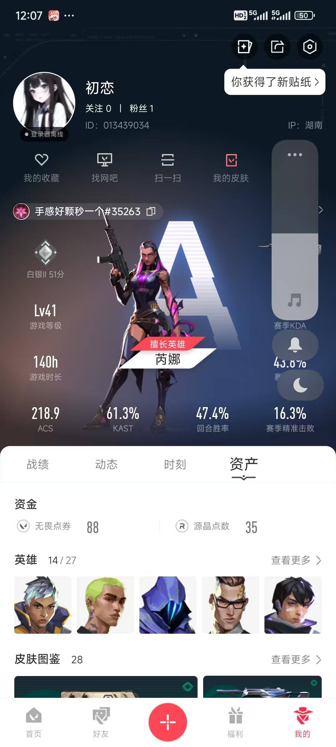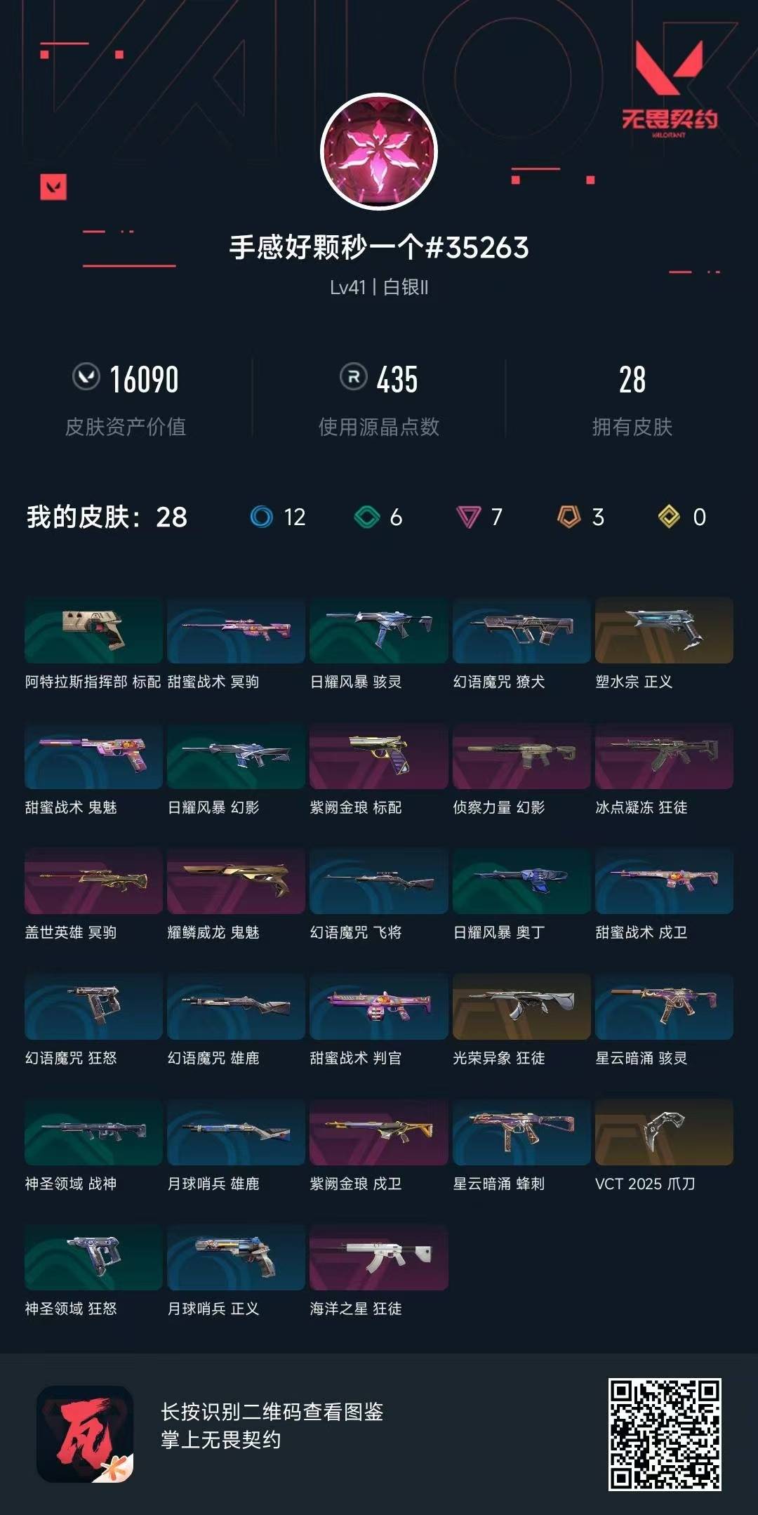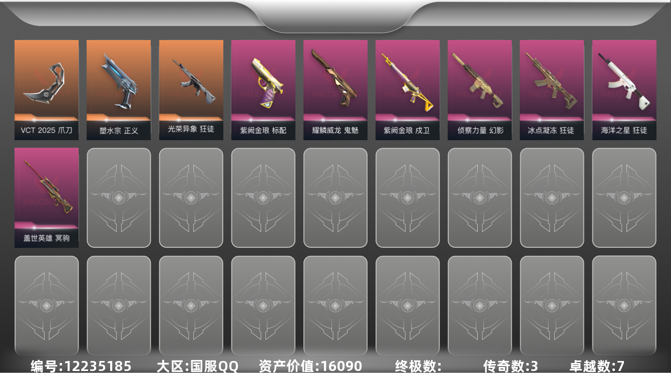 [12235185]3橙皮 7紫皮 28皮肤 14英雄 43卡面 435已用源晶 白银 优质装备:幻影-侦察力量,正义-塑水宗,标配-紫阙金琅,狂徒-冰点凝冻,VCT 2025 爪刀,戍卫-紫阙金琅,鬼魅-耀鳞威龙 套装:VCT 2025赛季礼包,VCTCN2025套装 步枪皮肤:狂徒-光荣异象,狂徒-海洋之星 狙击枪皮肤:冥驹-盖世英雄