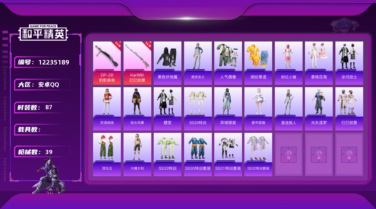 [12235189]2特效枪 2印记 可二次 可修改实名 优质装备:Kar98K-巳巳如意 稀有枪皮:DP-28-豹影疾电 五级特效枪:五级Kar98K-巳巳如意,五级DP-28-豹影疾电 紫色装扮:SS30特训套装,SS31特训套装,SS33特训套装,顶瓜瓜,人气偶像,黑色伏地魔,冰河战士,蝶变,香桃花海,缤纷果语,SS29特训,星途旅人,巳巳如意,异域银装,竞技名士,都市丽猫,街头风暴,光矢逐梦,粉红小猪,大橘大利,SS32特训服(SS32特训套装),恋语绒绒 优质战备:星途旅人降落伞