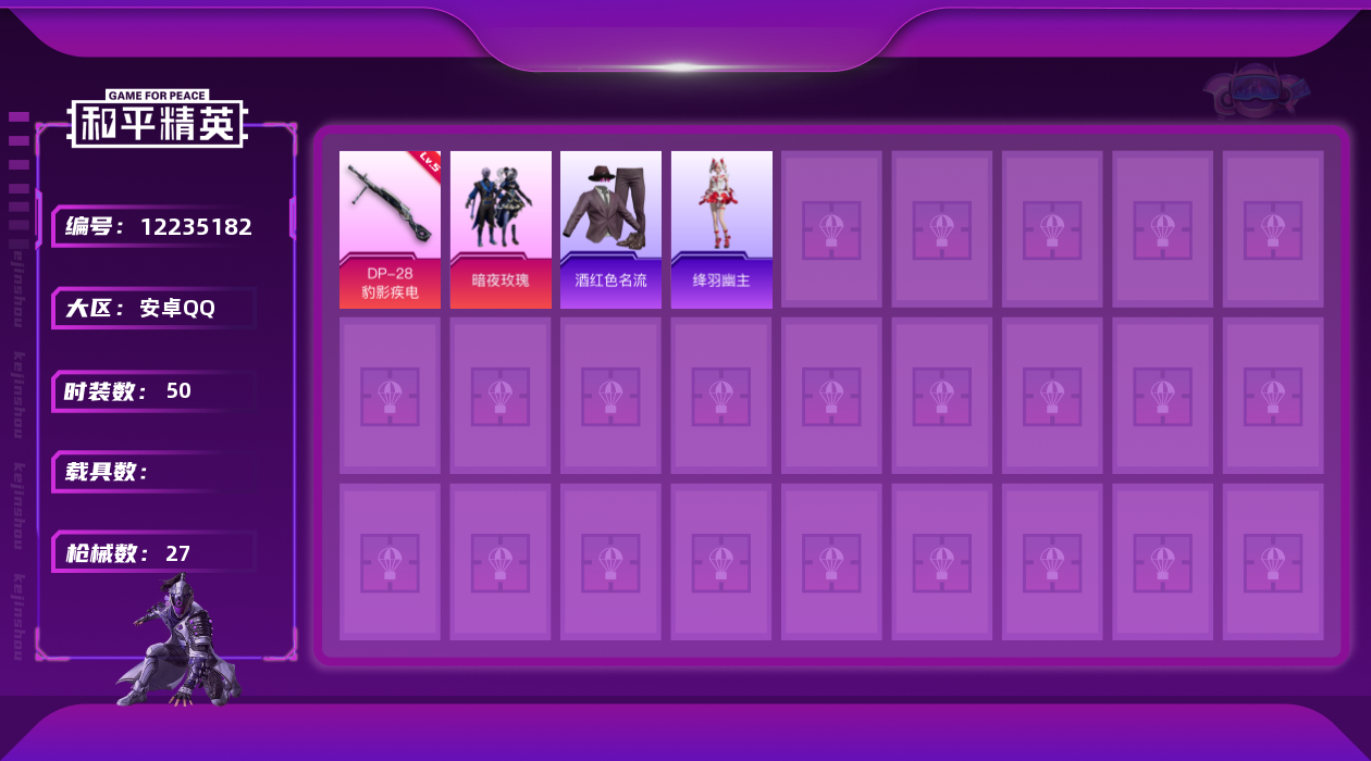 [12235182]1粉装 1特效枪 可二次 可修改实名 热门装扮:暗夜玫瑰 稀有枪皮:DP-28-豹影疾电 五级特效枪:五级DP-28-豹影疾电 紫色装扮:酒红色名流,绛羽幽主