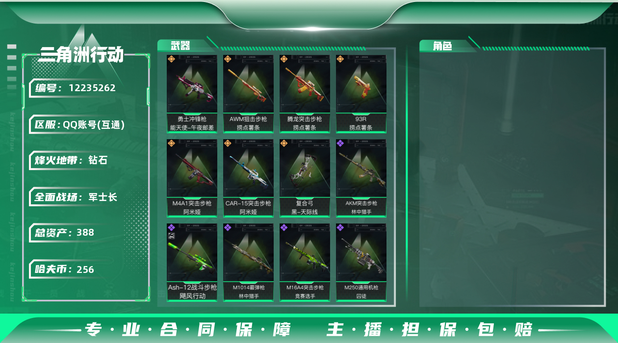 [12235262]总资产:388.1M 7传说枪械 哈夫币:256K 顶级安全箱(3×3)9.15号到期 可二次 可修改实名 优质装备:顶级安全箱(3x3) 烽火地带段位:钻石 全面战场段位:军士长 传说武器皮肤:M4A1突击步枪-阿米娅,CAR-15突击步枪-阿米娅,复合弓-黑-天际线,AWM狙击步枪-捞点薯条,腾龙突击步枪-捞点薯条,93R-捞点薯条,勇士冲锋枪-能天使-午夜邮差 史诗武器皮肤:Ash-12战斗步枪-飓风行动,AKM突击步枪-林中猎手,M16A4突击步枪-竞赛选手,M1014霰弹枪-林中猎手,SV-98狙击步枪-林中猎手,PTR-32突击步枪-英雄,M250通用机枪-囚徒,SCAR-H战斗步枪-囚徒,Vector冲锋枪-阿萨拉文明,M700狙击步枪-竞技风