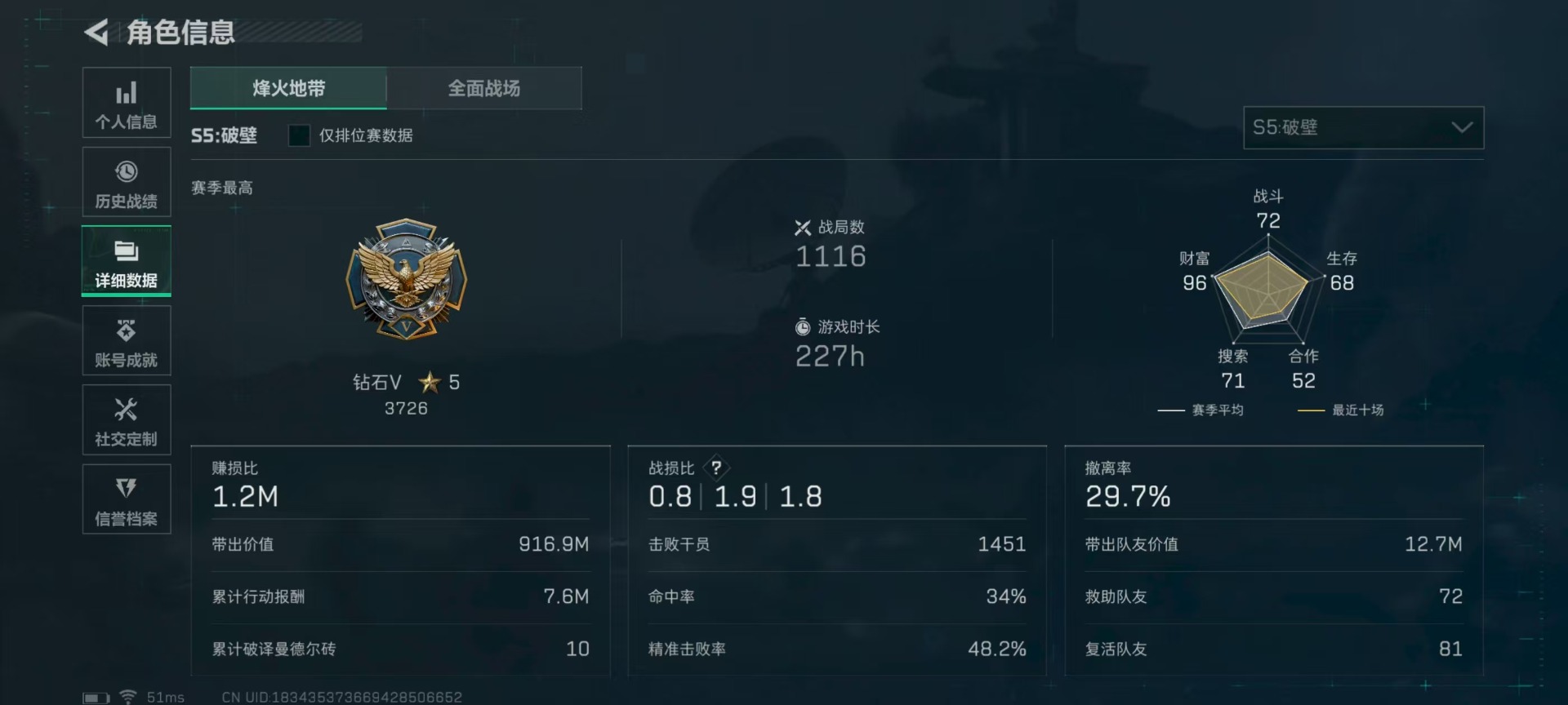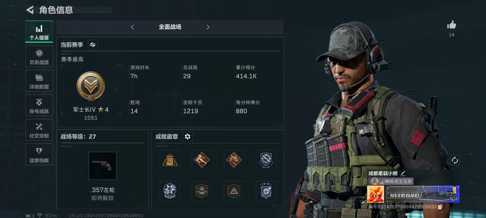 - [11876411]总资产:63.9M 3干员外观 1近战传说 12传说枪械 哈夫币:842.364K 高级安全箱(9.17到期) 可二次 可修改实名 优质装备:近战-北极星 烽火地带段位:三角洲巅峰 全面战场段位:无段位 传说武器皮肤:M4A1突击步枪-阿米娅,CAR-15突击步枪-阿米娅,复合弓-黑-天际线,AWM狙击步枪-捞点薯条,QCQ171冲锋枪-北极星,腾龙突击步枪-捞点薯条,93R-捞点薯条,勇士冲锋枪-能天使-午夜邮差,725双管霰弹枪-送葬人-无题密令,K437突击步枪-北极星,M4A1突击步枪-蚀金玫瑰 史诗武器皮肤:SVD狙击步枪-暗夜猎手,M16A4突击步枪-竞赛选手,PKM通用机枪-荒野求生,AKM突击步枪-林中猎手,SR-3M紧凑突击步枪-荒野求生,M1014霰弹枪-林中猎手,SV-98狙击步枪-林中猎手,SVD狙击步枪-荒野求生,AS Val突击步枪-典狱官,腾龙突击步枪-无垢,MP7冲锋枪-无垢,沙漠之鹰-曙光,S12K霰弹枪-曙光,M700狙击步枪-竞技风 干员外观:红狼-蚀金玫瑰,蜂医-送葬人·无题密令(S5),露娜-黑·天际线