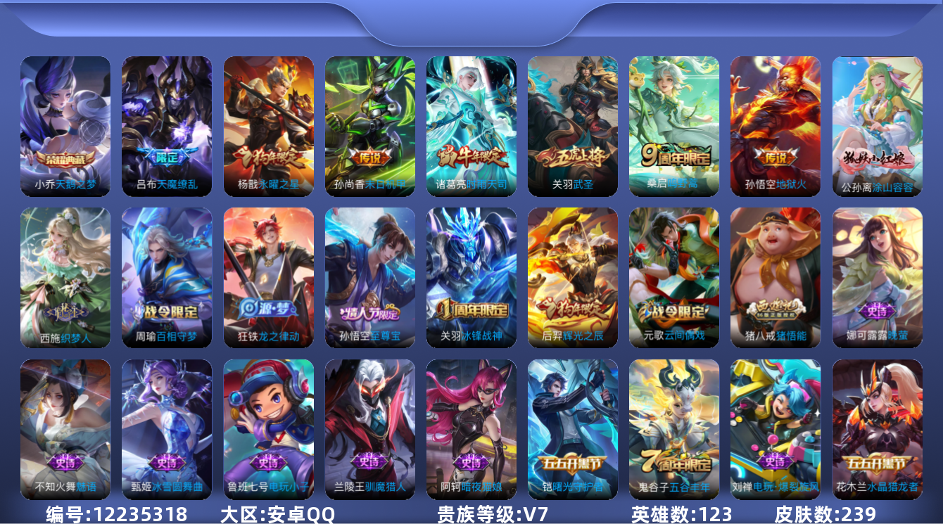 - [12090530]V10 7典藏 4无双 5珍品传说 46传说 125英雄 442皮肤 可修改实名 优质装备:天鹅之梦(小乔典藏),杀手不太冷,鸣剑·曳影,星域神启(倪克斯贼亮),九霄神辉(木兰典藏),弑枪猎影(韩信典藏),碎月剑心(李白无双),花合斗,离恨烟(公孙离无双),器灵·螭龙剑,最初的交响(伽罗典藏),怪盗基德,器灵·落星盏,大耳狗之梦,黑崎一护,黄金白羊座,久胜战神,炽阳神光,一念神魔,云霓雀翎,末日机甲-孙尚香(绿蚂蚱),地狱火,胖达荣荣,李逍遥,时之恋人-刘备(电焊工),超时空战士-狄仁杰,挚爱之约,碎云,神器·狴犴令,山海·炽霜斩(李信年限),山海·琳琅生(小乔年限),山海·苍雷引(电光曜子),画中仙,浮生妄,惊梅引,澜逐花归海,艾琳觅芳踪,千劫归真 珍品传说:时之奇旅-孙策 传说皮:乘龙·问璇玑(孙尚香年限),乘龙·铭钟鼎(赵云年限),乘龙·淬吴钩(孙策年限),吕布曦玄引,云诺千山,铠冥王哈迪斯,续相思,星之鸣奏,幻光神枪 珍宝阁皮:妄想食味,优雅恋人,女武神 限定皮:愿照·九州拓(澜年限),愿照·山河定(司空震年限),愿照·千秋盛(女娲年限),逐霄战戟,鸣野蒿,至尊宝,凤求凰(白切鸡),太华(伽罗年限),傲雪梅枪,前尘镜,绯月行,白晶晶,神威(电光马子),飞衡(韩信年限),玄嵩(庄周年限),山海·碧波行(瑶年限),遇见飞天,高山流水,诗剑行,齐天大圣,五谷丰年,冰锋战神,武圣,梁祝,天狼狩猎者,李小龙,逐梦之影,朱雀志(守约年限),如梦令-后羿,默契交锋-兰陵王,真爱至上,孙行者,猪悟能,一生所爱,大圣娶亲,引擎之心,青春决赛季,冰霜恋舞曲,云端筑梦师,蜜橘之夏,匿光追影者,寅虎·心曲(虎婆),寅虎·赤拳(老虎年限),百木心枪,玉兔公主,山海·玄木吟(马可年限),冰霜神祇 史诗皮:鸭鸭历险记-刘禅,飞车小橘子,器灵·浮梦炉,糖绘人间,绮世丹青,化蝶舞,灵蛊蚀心,星界战将,谪仙醉月,龙之律动,雪豹·霜爪,石田雨龙,百相守梦-周瑜,茶境仙,炽弈燎原,东方月初,埋骨钱,海诺心动手记,上官婉儿群星魔术团,曹操夜都魔契,乘龙·聚宝船(安琪拉年限),乘龙·忆丹青(大乔年限),紫霞仙子,苍穹之光,电玩小子(小书包),黄金分割率,特工魅影,千年之狐,永昼,魅语,蒙恬荣光圣徽,无限星赏官,冰冠公主,偶像歌手,白蛇,晚萤,电玩·爆裂旋风,暗夜猫娘,龙骑士(小龙虾),末日机甲-吕