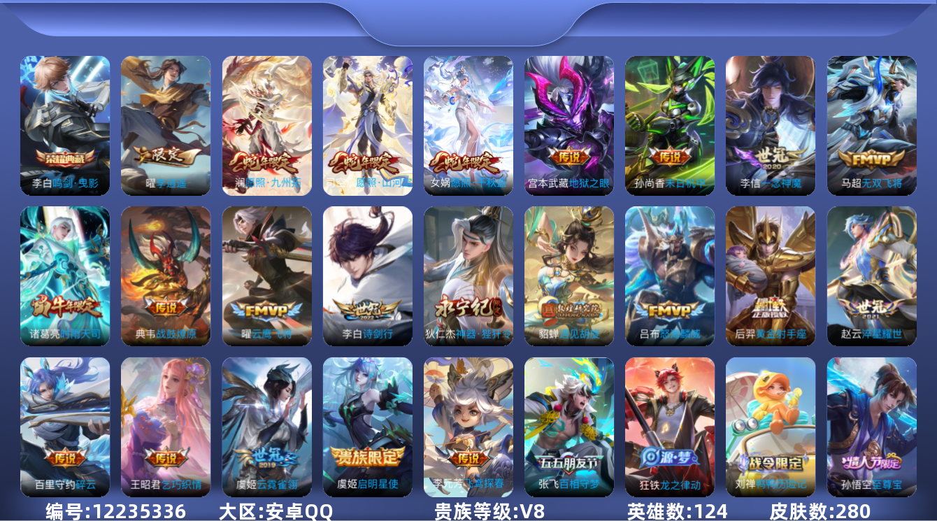 [12235336]【商品标题】:安卓Q-V8-永恒钻石II段位-124英雄-280皮肤-1典藏-0珍品无双-0无双-0珍品传说-23传说-91史诗