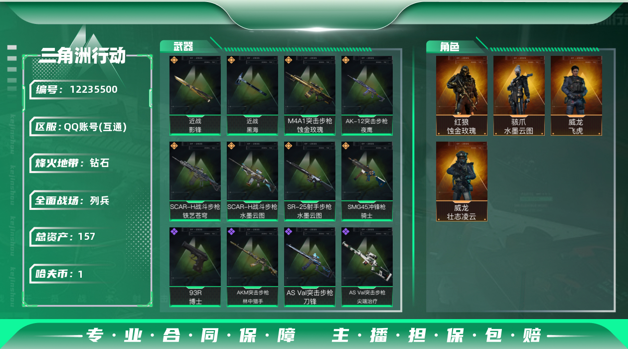 [12235500]总资产:157.2 4干员外观 2近战传说 8传说枪械 可二次 可修改实名 烽火地带段位:钻石 全面战场段位:列兵 哈夫币:1.061 传说武器皮肤:近战-影锋,近战-黑海,SCAR-H战斗步枪-水墨云图,SR-25射手步枪-水墨云图,SCAR-H战斗步枪-铁艺苍穹,AK-12突击步枪-夜鹰,SMG45冲锋枪-骑士,M4A1突击步枪-蚀金玫瑰 史诗武器皮肤:SR-3M紧凑突击步枪-英雄,QBZ95-1突击步枪-ACE,M4A1突击步枪-特勤执行,AUG突击步枪-特勤执行,Vector冲锋枪-红色彗星,PTR-32战斗步枪-ACE,AUG突击步枪-蝮蛇,M700狙击步枪-蝮蛇,PKM通用机枪-蝮蛇,G3战斗步枪-战场英杰,AS Val突击步枪-尖端治疗,M700狙击步枪-守夜人,AKM突击步枪-林中猎手,SVD狙击步枪-暗夜猎手,M1014霰弹枪-林中猎手,QBZ95-1突击步枪-曙光,Vector冲锋枪-阿萨拉文明,SVD狙击步枪-阿萨拉工艺,S12K霰弹枪-曙光,AS Val突击步枪-刀锋,PKM通用机枪-英雄,QSZ92G-风林火山,93R-博士 干员外观:红狼-蚀金玫瑰,威龙-壮志凌云,骇爪-水墨云图,威龙-飞虎