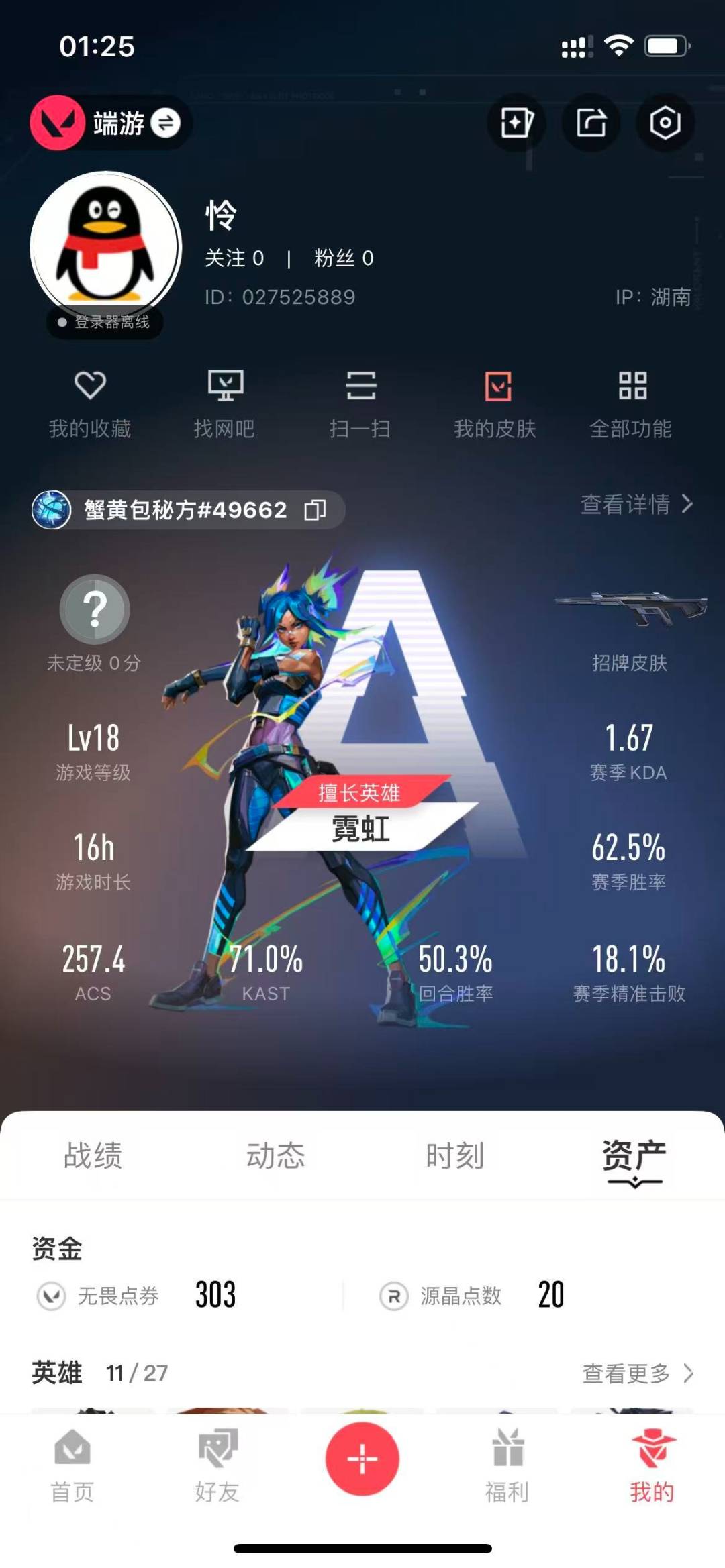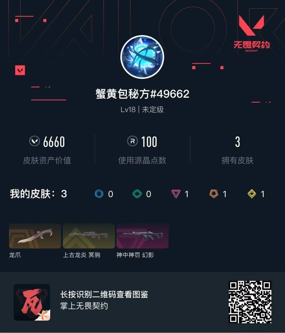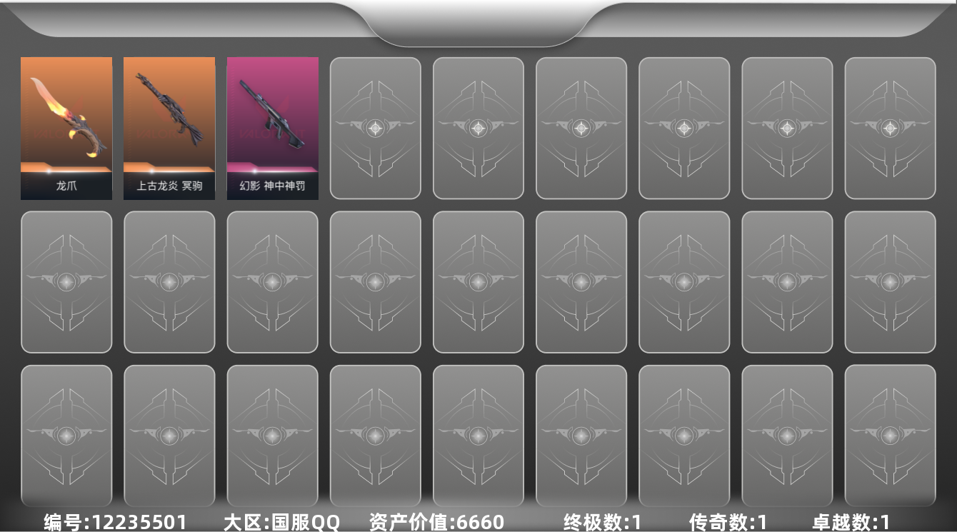 [12235501]1橙皮 1金皮 1紫皮 3皮肤 11英雄 11卡面 100已用源晶 未定级 优质装备:龙爪 步枪皮肤:幻影-神中神罚 狙击枪皮肤:冥驹-上古龙炎