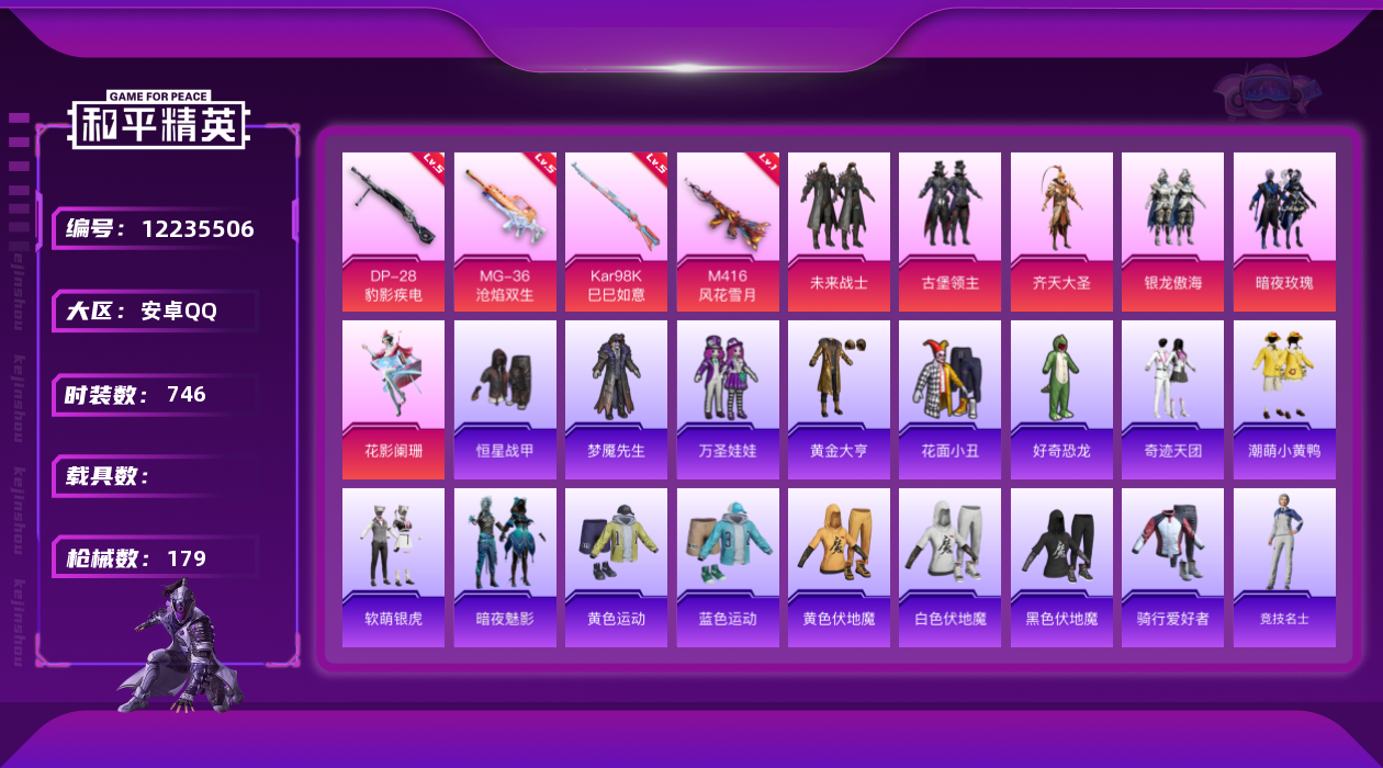 - PX_2111803- 苹果手Q-2王牌印记-4粉装-5特效枪-0载具-33089热力值-74套装-98枪皮-1卓越印记-0传奇印记 【4粉装】,冷漠罗丽,紫电风暴,炙焰牛王,绮梦青鸾 【5特效枪】SCAR-L-甜梦小狐-6级 GROZA-镜光银凌-5级 AUG-暖羊咩咩-5级 Kar98K-巳巳如意-5级 M24-暗星紫秘-5级 【2稀有紫装】,小丑鱼,龟仙人, 【74稀有时装】,SS31特训