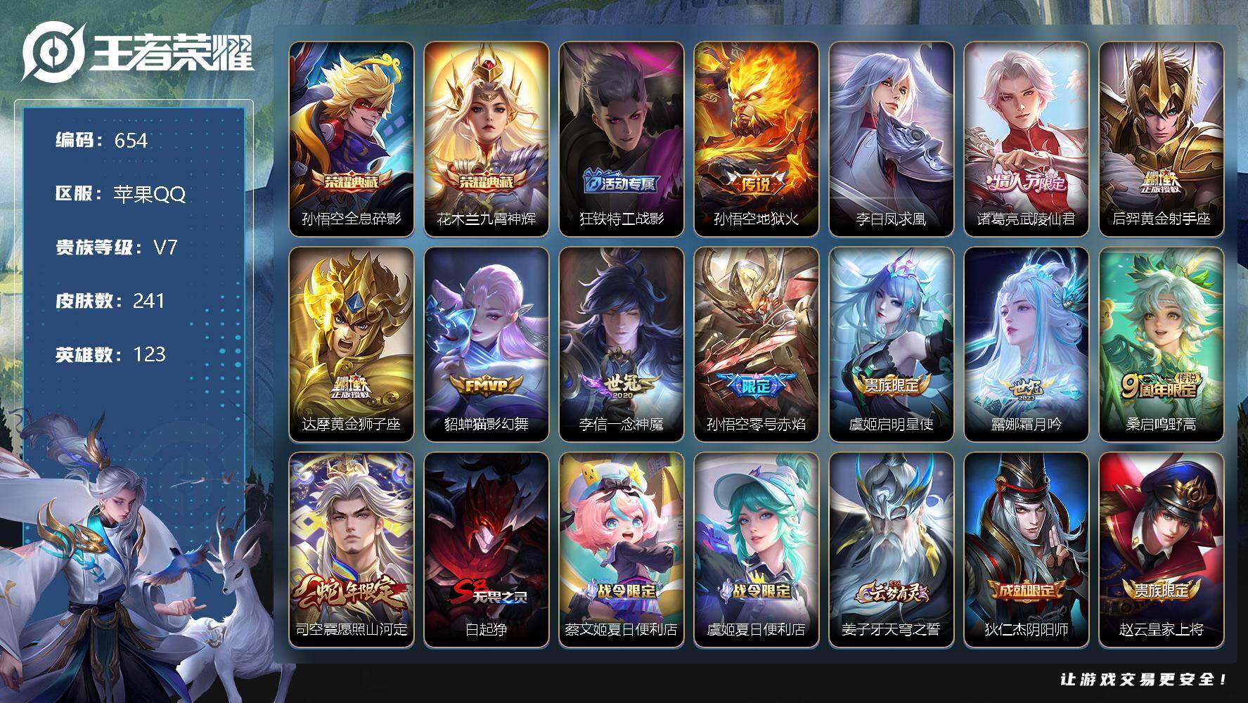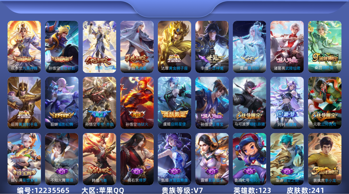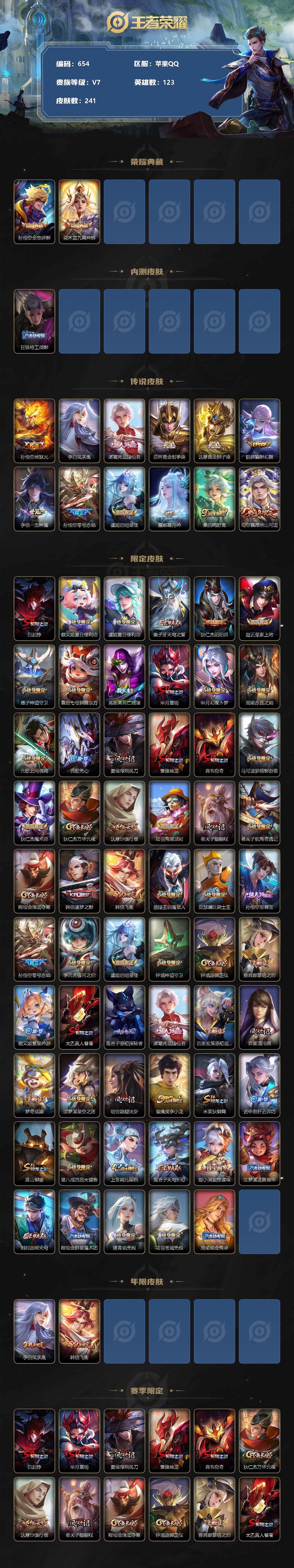 [12235565]【商品标题】:苹果Q-V7-最强王者段位-123英雄-241皮肤-2典藏-0珍品无双-0无双-0珍品传说-12传说-68史诗