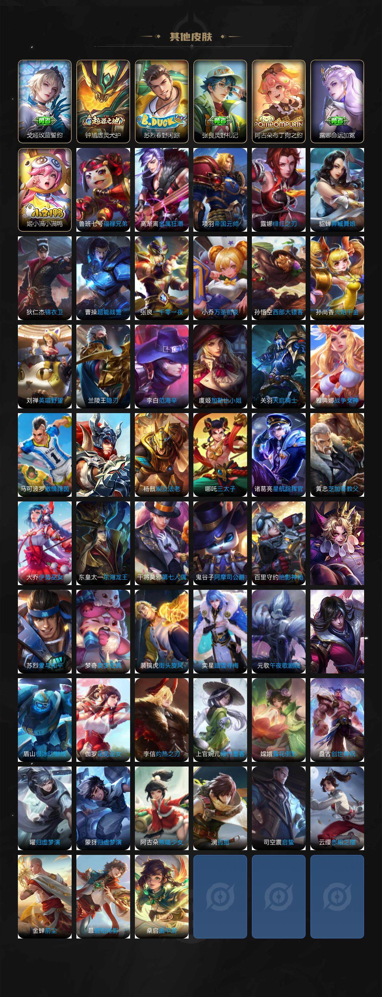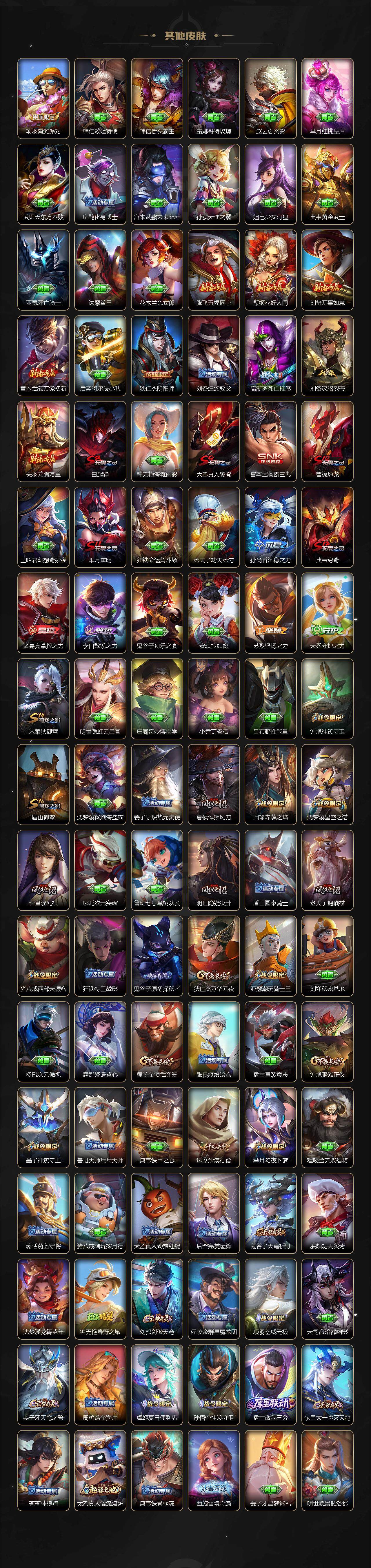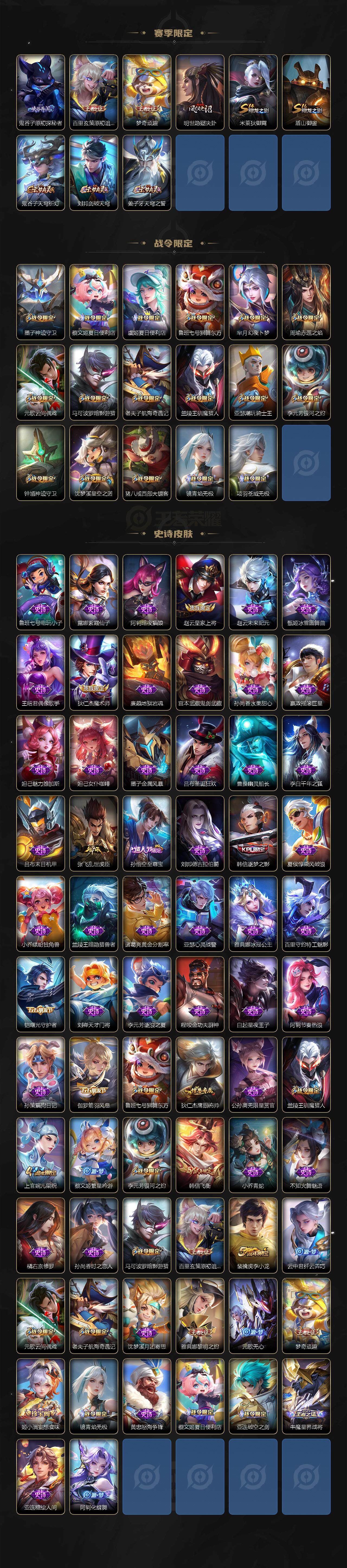 【限定皮肤】:白起狰,蔡文姬夏日便利店,虞姬夏日便利店,姜子牙天穹之誓,狄仁杰阴阳师,赵云皇家上将,墨子神迹守卫,鲁班七号狮舞东方,高渐离死亡摇滚,芈月重明,芈月幻夜卜梦,周瑜赤莲之焰,元歌云间偶戏,元歌无心,夏侯惇朔风刀,曹操烛龙,典韦穷奇,马可波罗暗影游猎,狄仁杰魔术师,狄仁杰万华元夜,达摩沙漠行僧,项羽海滩派对,老夫子醍醐杖,老夫子航海奇遇记,程咬金演武夺筹,韩信逐梦之影,韩信飞衡,兰陵王驯魔猎人,亚瑟潮玩骑士王,孙悟空至尊宝,孙悟空零号赤焰,李元芳银河之约,虞姬启明星使,钟馗神迹守卫,钟馗驱傩正仪,雅典娜黎明之约,蔡文姬繁星吟游,太乙真人饕餮,鬼谷子原初探秘者,诸葛亮武陵仙君,百里玄策原初追逐者,弈星混沌棋,梦奇顽趣,沈梦溪星空之诺,明世隐疑决卦,裴擒虎李小龙,米莱狄御霄,云中君纤云弄巧,盾山御銮,猪八戒西部大镖客,上官婉儿梁祝,鬼谷子天穹祈灯,姬小满妄想食味,沈梦溪龙舞盛年,刘邦剑破天穹,程咬金群星魔术团,镜青焰无极,项羽苍威无极,周瑜熔金海岸