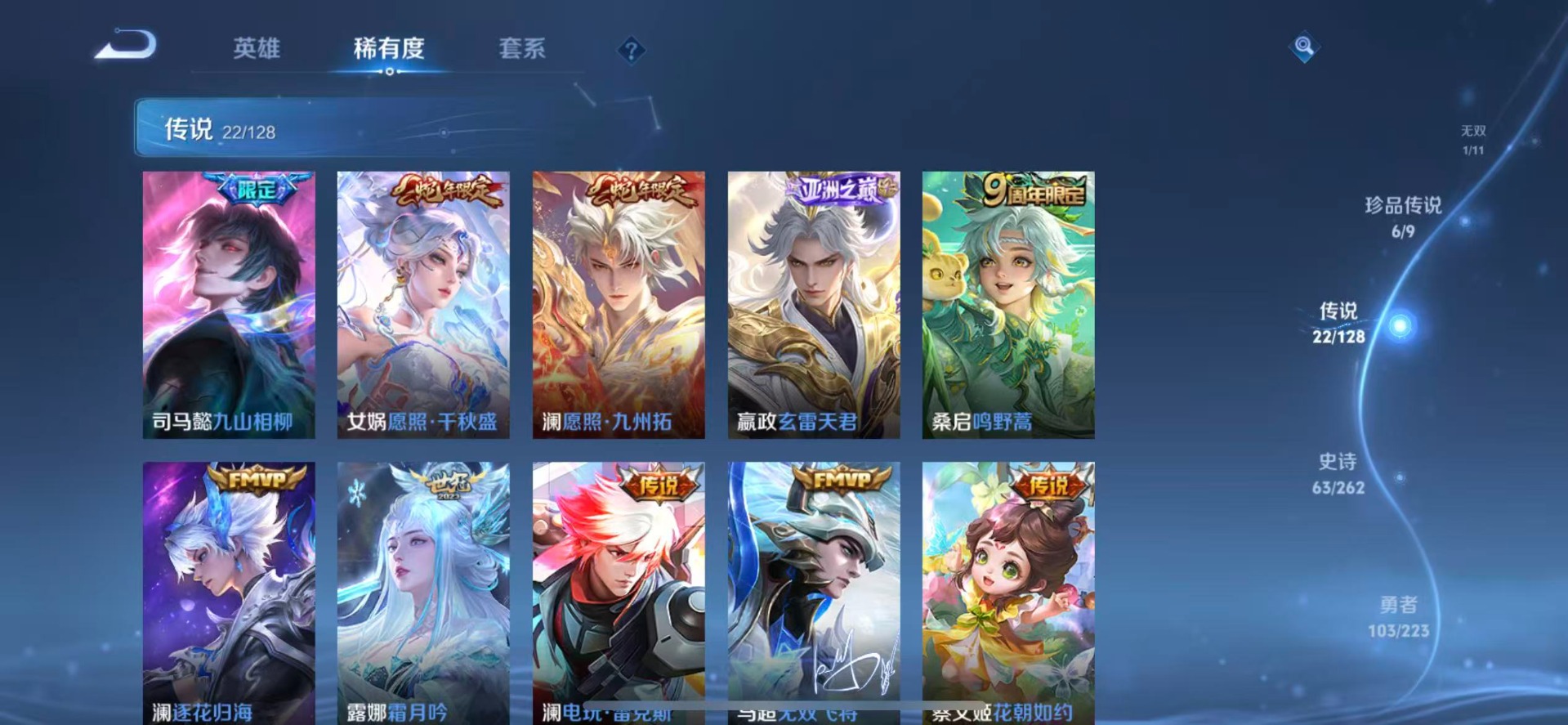 黄忠烈魂,吕布御风骁将,露娜一生所爱,裴擒虎李小龙,上官婉儿梁祝,桑启鸣野蒿,女娲愿照·千秋盛,孙悟空至尊宝,马超神威,澜愿照·九州拓,关羽冰锋战神