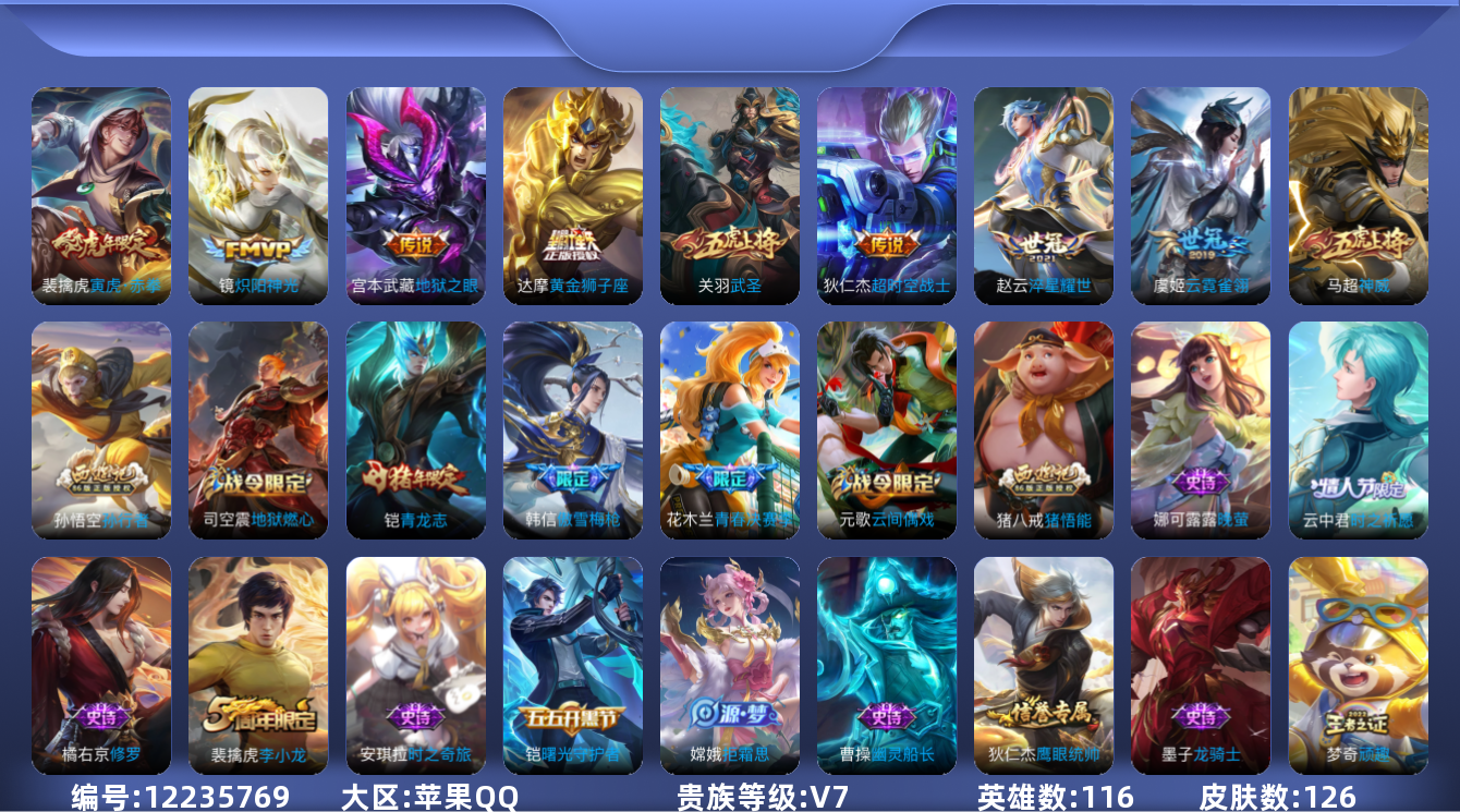 [12235769]V7 8传说 116英雄 126皮肤 可修改实名 优质装备:黄金狮子座,炽阳神光,云霓雀翎,地狱之眼,淬星耀世,超时空战士-狄仁杰 珍宝阁皮:玩趣恶龙 限定皮:傲雪梅枪,神威(电光马子),高山流水,青龙志(铠年限),武圣,李小龙,孙行者,猪悟能,青春决赛季,匿光追影者,寅虎·御盾(廉颇年限),寅虎·赤拳(老虎年限),时之祈愿-云中君 史诗皮:冰冠公主,江河有灵,晚萤,偶像歌手,龙骑士(小龙虾),猫狗日记-孙策,节奏热浪,修罗,摇滚巨星,水果甜心,时之奇旅-安琪拉,功夫厨神,德古拉伯爵,暗隐猎兽者,幽灵船长,舞动绿茵,地狱岩魂,拒霜思,缤纷独角兽,逐浪之夏,曙光守护者,热力回旋,金属风暴,圣诞狂欢,鹰眼统帅,魅力维加斯,寅虎·御盾,未来纪元-赵云