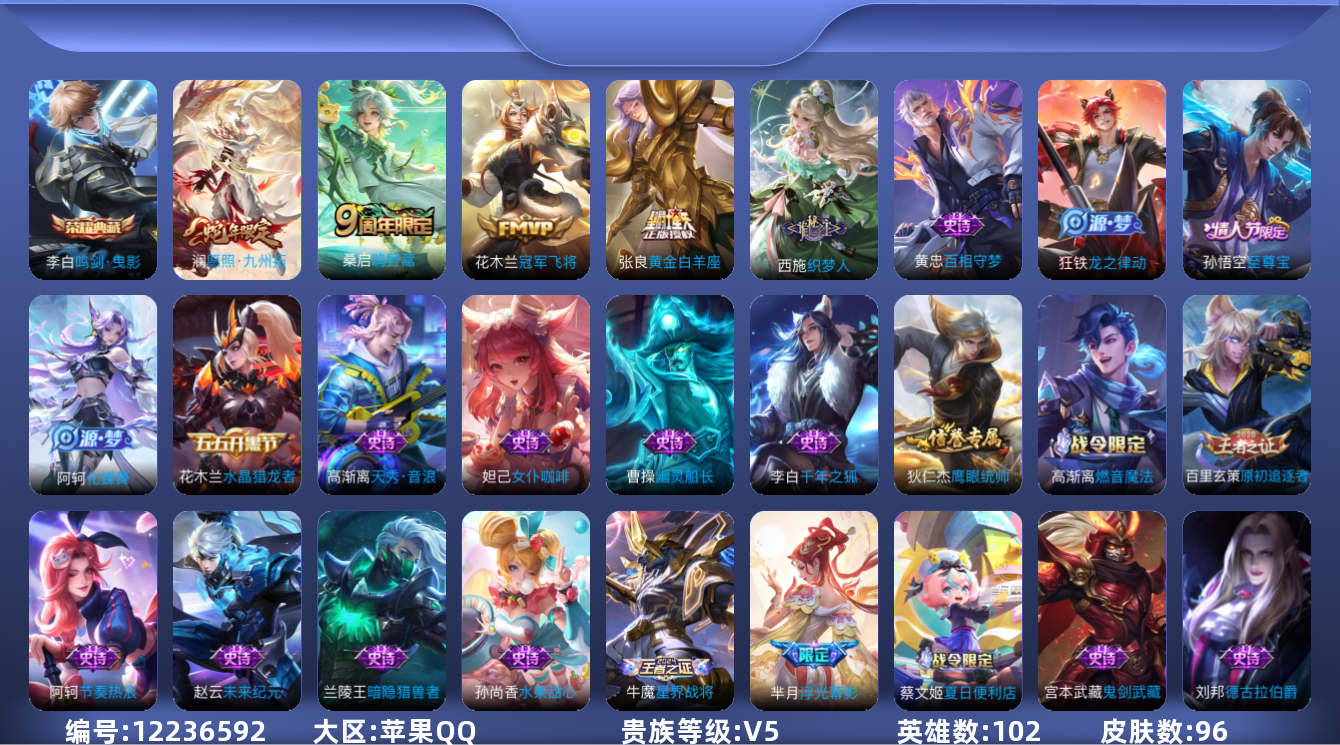 [12236592]V5 1典藏 4传说 102英雄 96皮肤 可修改实名 优质装备:鸣剑·曳影,冠军飞将,黄金白羊座 珍宝阁皮:玩趣恶龙 限定皮:愿照·九州拓(澜年限),逐霄战戟,鸣野蒿,至尊宝 史诗皮:化蝶舞,星界战将,龙之律动,蒙犽顽岩魄,芈月浮光幕影,百相守梦-黄忠,织梦人,千年之狐,高渐离燃音魔法,节奏热浪,女仆咖啡,水果甜心,德古拉伯爵,暗隐猎兽者,幽灵船长,鬼剑武藏,舞动绿茵,水晶猎龙者,原初追逐者,鹰眼统帅,魅力维加斯,天秀·音浪,未来纪元-赵云
