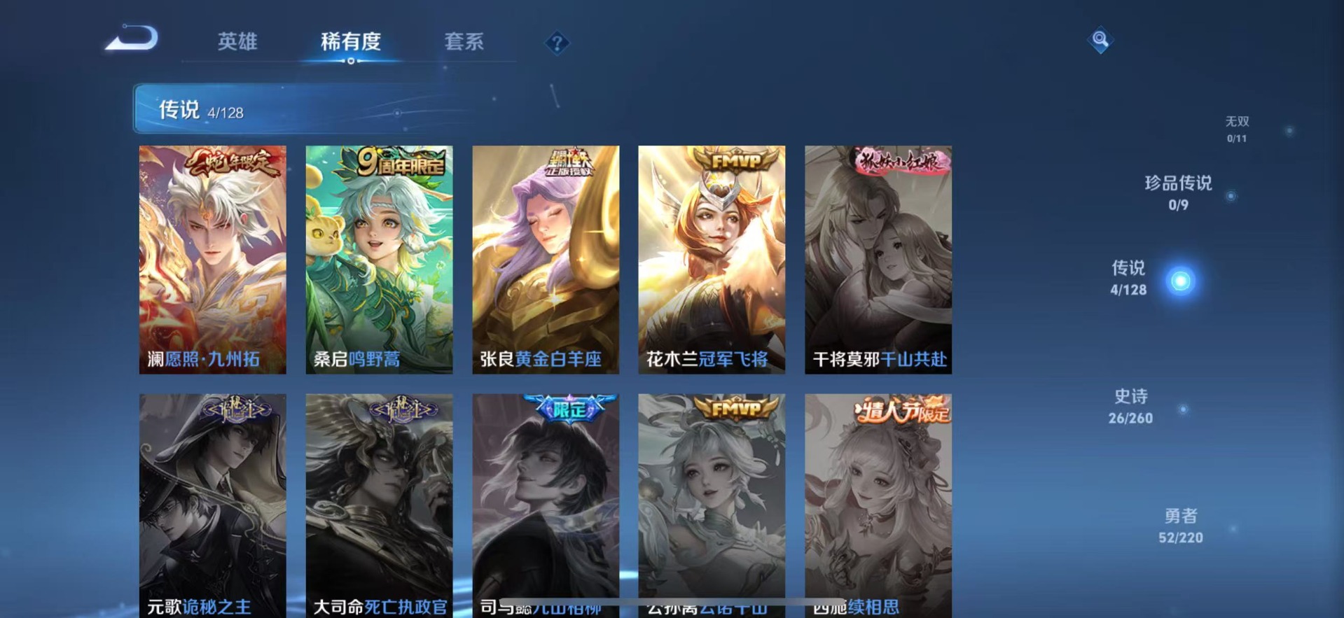 - [12111244]V7 1典藏 3传说 123英雄 226皮肤 典藏英雄武则天 可修改实名 优质装备:鸣剑·曳影,黄金狮子座,末日机甲-孙尚香(绿蚂蚱) 珍宝阁皮:妄想食味,优雅恋人 限定皮:鸣野蒿,至尊宝,遇见飞天,梁祝,天狼狩猎者,李小龙,神奇女侠,寅虎·御盾(廉颇年限) 史诗皮:蒙犽顽岩魄,紫霞仙子,苍穹之光,电玩小子(小书包),白龙吟,黄金分割率,蒙恬荣光圣徽,冰冠公主,电玩·爆裂旋风,暗夜猫娘,龙骑士(小龙虾),末日机甲-吕布,猫狗日记-孙策,乱世虎臣,节奏热浪,摇滚巨星,水果甜心,绅士熊喵,星夜王子,功夫厨神,德古拉伯爵,幽灵船长,鬼剑武藏,天秀·启明,舞动绿茵,地狱岩魂,繁星吟游(呼啦呼啦),乘风破浪,逐浪之夏,水晶猎龙者,曙光守护者,金属风暴,原初追逐者,圣诞狂欢,圣诞恋歌,鹰眼统帅,暗夜贵公子,魅力维加斯,寅虎·御盾,未来纪元-赵云